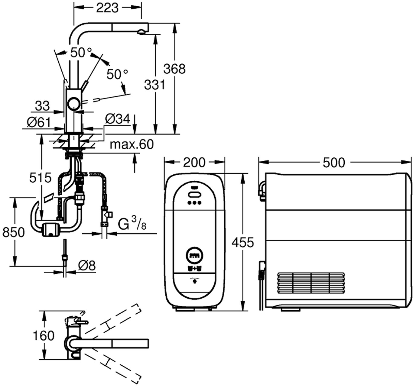 består av:GROHE Blue Home ettgrepsbatteri med rensefilteretthullsmontasjeL-tuttrykknapper for 3 typer filtrert og avkjølt vannstille, medium, musserendeGROHE StarLight-overflateGROHE SilkMove 28 mm keramisk patronuttrekkbar perlatorsvingbar rørtutsvingradius 360°separate vannveier for filtrertog ikke-filtrert vannfleksible tilkoblingsslangerGROHE Blue Home kjølerleverer 3 liter nedkjølt vann med kullsyre per time180 Watt kjøleenhet, 230 V, 50 Hzlydnivå ved standby 44 dB(A)type av beskyttlese IP 21CE-nummerKrever ventilasjonshull i bunnen av kjøkkenskapetProgramvareoppsett og overvåking av filter og CO<sub>2</sub> kapasitet mulig via GROHE Ondus appmed Bluetooth 4.0* og WIFI-grensesnitt for trådløs datakommunikasjonfor Apple** og Android enheterBluetooth rekkevidde (max. 10 m) varierer avhengig av debrukte materialene og vegger mellom avsender og mottakerjusterbar for GROHE Blue filtrer størrelse S, GROHE Blue aktivert karbon filter og GROHE Blue magnesium + filterGROHE Blue filter str. S, filter, hode med justerbar vannstyrkefor regioner med vannhardhet på mer enn 9 ° dKHFor regioner med vannhardhet under 9 ° dKH,vennligst bestil vårt karbonfilter 40 547 001GROHE Blue 425 g CO<sub>2</sub> flaskeSystemkrav AppleiPhone med iOS 12.0 eller nyereSystemkrav AndroidSmarttelefon med Android 6.0 eller nyereMobilenheter og GROHE Watersystems App*** er ikke inkludert i leveransen og må bestilles/installeres separat via en autorisert Apple-forhandler/Apple Store/iTunes eller Google Play Store.* Bluetooth merket og logo er registrerte varemerker som eies av Bluetooth SIG, Inc. og all bruk av dette varemerket av Grohe AG er under lisens. Andre varemerker og enheter er under respektive eiere.** Apple, Apple logoen, iPod, iPod Touch, iPhone og iTunes er varemerker under Apple Inc., registrert i USA og andre land. Apple er ikke ansvarlig for funksjonen til denne enheten eller overholdelsen av sikkerhets- og forskriftsstandarder.*** Tilgjengelig grats i iTunes eller i Google Play store.Dette produktet inneholder stoffer som er erklært som et farlig stoff. Finn mer informasjon i sikkerhetsdatabladet. Du kan laste ned sikkerhetsdataene på: www.grohe.com/safety-data-sheets/Vann- og avløpsinstallasjoner må installeres av rørlegger.
