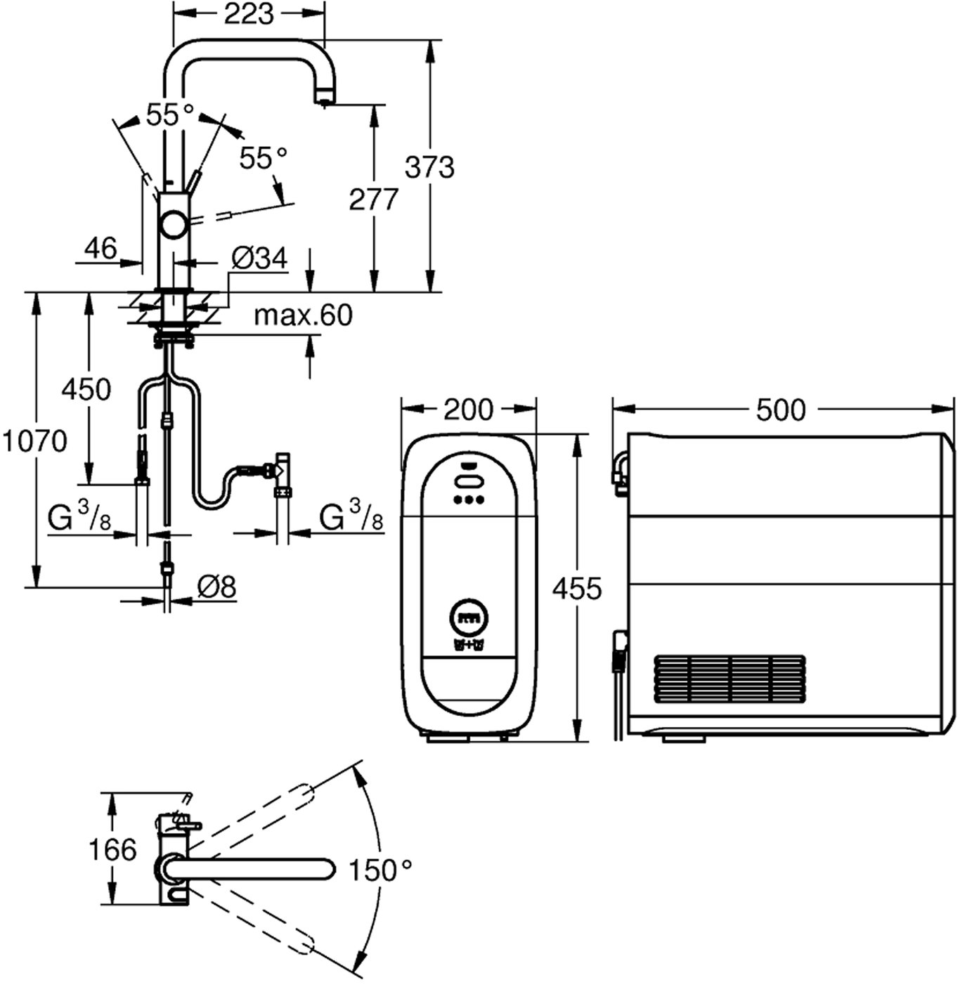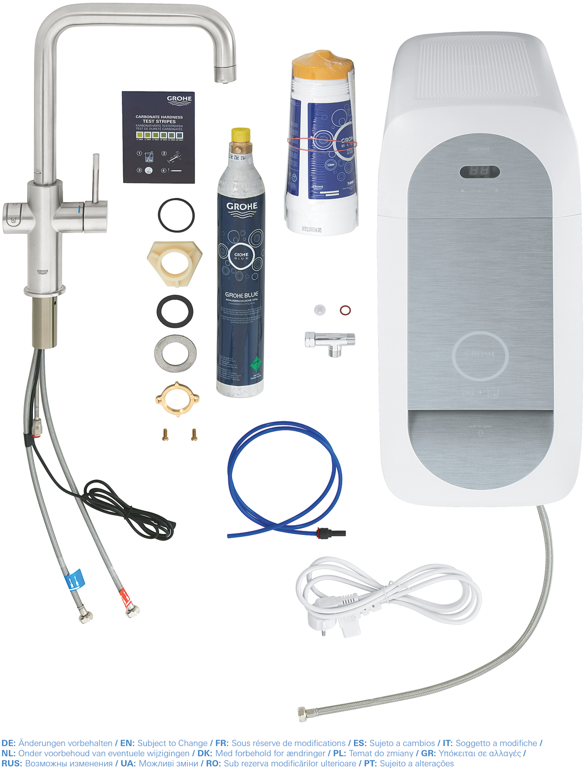 består av:GROHE Blue Home ettgrepsbatteri med rensefilteretthullsmontasjeU-tuttrykknapper for 3 typer filtrert og avkjølt vannstille, medium, musserendeGROHE StarLight-overflateGROHE SilkMove 28 mm keramisk patronsvingbar rørtutsvingfelt 150°separate vannveier for filtrertog ikke-filtrert vannfleksible tilkoblingsslangerGROHE Blue Home kjølerleverer 3 liter nedkjølt vann med kullsyre per time180 Watt kjøleenhet, 230 V, 50 Hzlydnivå ved standby 44 dB(A)type av beskyttlese IP 21CE-nummerKrever ventilasjonshull i bunnen av kjøkkenskapetProgramvareoppsett og overvåking av filter og CO<sub>2</sub> kapasitet mulig via GROHE Ondus appmed Bluetooth 4.0* og WIFI-grensesnitt for trådløs datakommunikasjonfor Apple** og Android enheterBluetooth rekkevidde (max. 10 m) varierer avhengig av debrukte materialene og vegger mellom avsender og mottakerjusterbar for GROHE Blue filtrer størrelse S, GROHE Blue aktivert karbon filter og GROHE Blue magnesium + filterGROHE Blue filter str. S, filter, hode med justerbar vannstyrkefor regioner med vannhardhet på mer enn 9 ° dKHFor regioner med vannhardhet under 9 ° dKH,vennligst bestil vårt karbonfilter 40 547 001GROHE Blue 425 g CO<sub>2</sub> flaskeSystemkrav AppleiPhone med iOS 12.0 eller nyereSystemkrav AndroidSmarttelefon med Android 6.0 eller nyereMobilenheter og GROHE Watersystems App*** er ikke inkludert i leveransen og må bestilles/installeres separat via en autorisert Apple-forhandler/Apple Store/iTunes eller Google Play Store.* Bluetooth merket og logo er registrerte varemerker som eies av Bluetooth SIG, Inc. og all bruk av dette varemerket av Grohe AG er under lisens. Andre varemerker og enheter er under respektive eiere.** Apple, Apple logoen, iPod, iPod Touch, iPhone og iTunes er varemerker under Apple Inc., registrert i USA og andre land. Apple er ikke ansvarlig for funksjonen til denne enheten eller overholdelsen av sikkerhets- og forskriftsstandarder.*** Tilgjengelig grats i iTunes eller i Google Play store.Dette produktet inneholder stoffer som er erklært som et farlig stoff. Finn mer informasjon i sikkerhetsdatabladet. Du kan laste ned sikkerhetsdataene på: www.grohe.com/safety-data-sheets/Vann- og avløpsinstallasjoner må installeres av rørlegger.