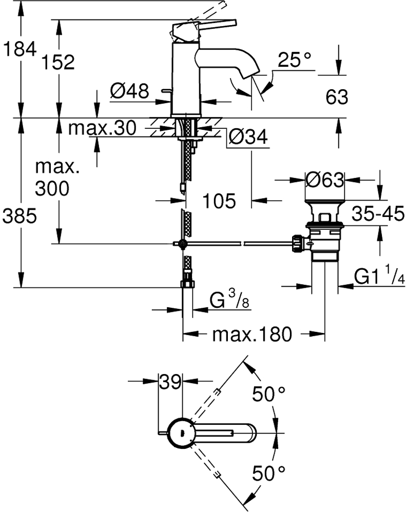 Servantbatteriet har en vannbesparende perlator, Grohe Water Saving™-teknologi, som reduserer vannforbruket uten at det går utover ytelsen. Grohe Classic er rask og enkel å installere, og kommer med fleksible tilkoblingsslanger. Den kommer også med oppløft med avløpsgarnityr.