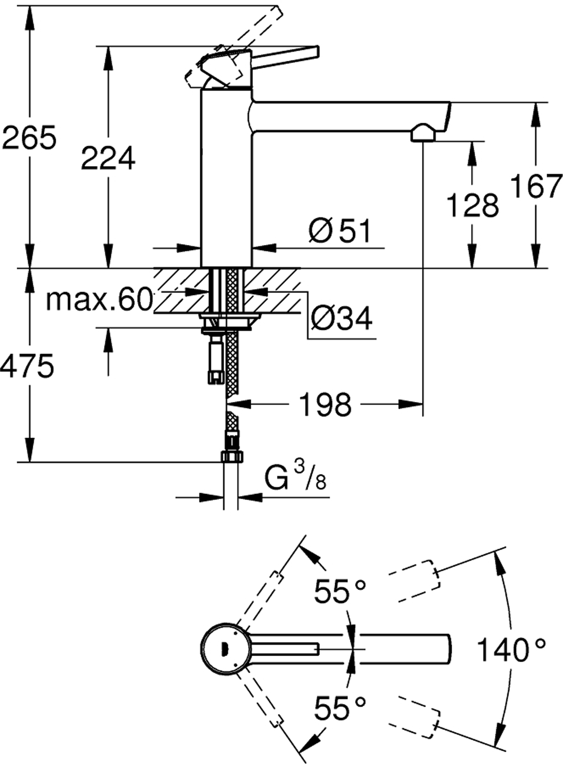 medium tutetthullsmontasjeGROHE StarLight-overflateGROHE SilkMove 35 mm keramisk Patronperlatorvariable justerbar volumbegrensersvingbar tutsvingradius 140°fleksible tilkoblingsslangerhurtig-montasje-systemmin. trykk 1.0 barVann- og avløpsinstallasjoner må installeres av rørlegger.