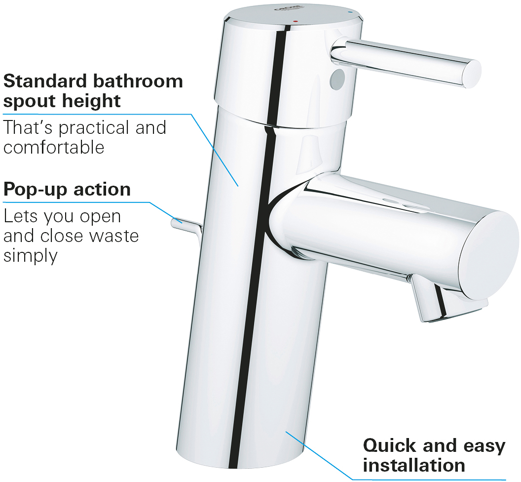 Denne baderomskranen fra Concetto-kolleksjonen er det ultimate innen både utseende og funksjonalitet. Den har perfekt høyde for alle vanlige servanter, og den har standardtut. Den integrerte oppløftsventilen på baksiden gjør det enkelt å åpne og stenge proppen. GROHE SilkMove-teknologi gjør det enkelt å justere både vannmengde og temperatur. Den slitesterke GROHE StarLight kromfinishen har en fantastisk glans som virkelig vil skille seg ut på baderommet og vare i mange år. Hver minste detalj er gjennomtenkt, og vårt enkle installasjonssystem gjør at denne servantkranen kan monteres på et øyeblikk.