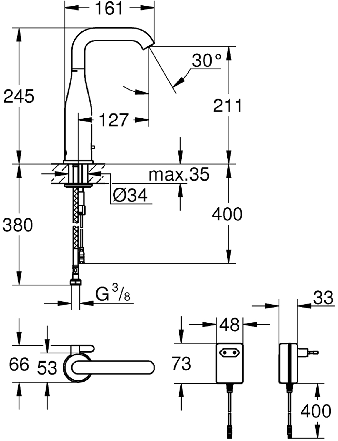 med infrarød sensor for toveis kommunikasjon formonitorering, konfigurering og service grunnlagmed omformer 100-230 V AC, 50-60 Hz, 6 V DCGROHE StarLight krom overflatesvingradius 0° / 150° / 360°vannbesparende perlator 5,0 l/minfleksible tilkoblingsslangertilbakeslagsventilsilermed integrert magnetventilhurtig-montasje-system7 forhåndsstilte programmer:automatisk skyllningtermisk desinfeksjonrensemodusTilleggs funksjon og presise settinger via fjernkontroll 36 407CE-nummerlydklasse 1 etter DIN 4109beskyttelse IP59Kmin. trykk 1.0 barVann- og avløpsinstallasjoner må installeres av rørlegger.