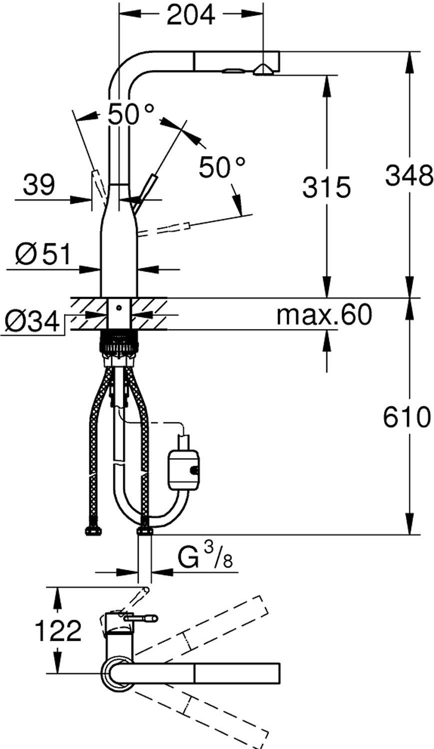 høy tutetthullsmontasjeGROHE StarLight-overflateGROHE SilkMove 28 mm keramisk patronflytbegrenserUttrekkbar spraykontroll - bytter frem og tilbakemellom vanlig vannstrøm og spraystråleomstiller: laminar spray / SpeedClean jet-dusjautomatisk tilbakestilling til laminar spraymetall dusjtutsvingbar rørtutsvingradius 360°integrert tilbakeslagsventilmed tilbakeslagsventilfleksible tilkoblingsslangerhurtig-montasje-systemintegrert temperaturbegrensermin. trykk 1.0 barVann- og avløpsinstallasjoner må installeres av rørlegger.