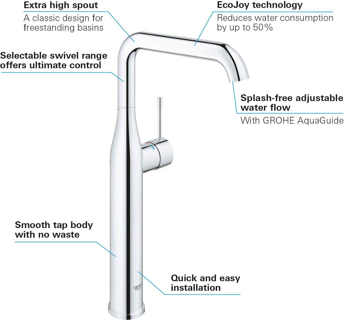 Essence servantbatteri fra Grohe har en slitesterk overflate i krom, som er enkel å holde ren. Den har ekstra høy tut som gjør at den passer perfekt til frittstående servanter.