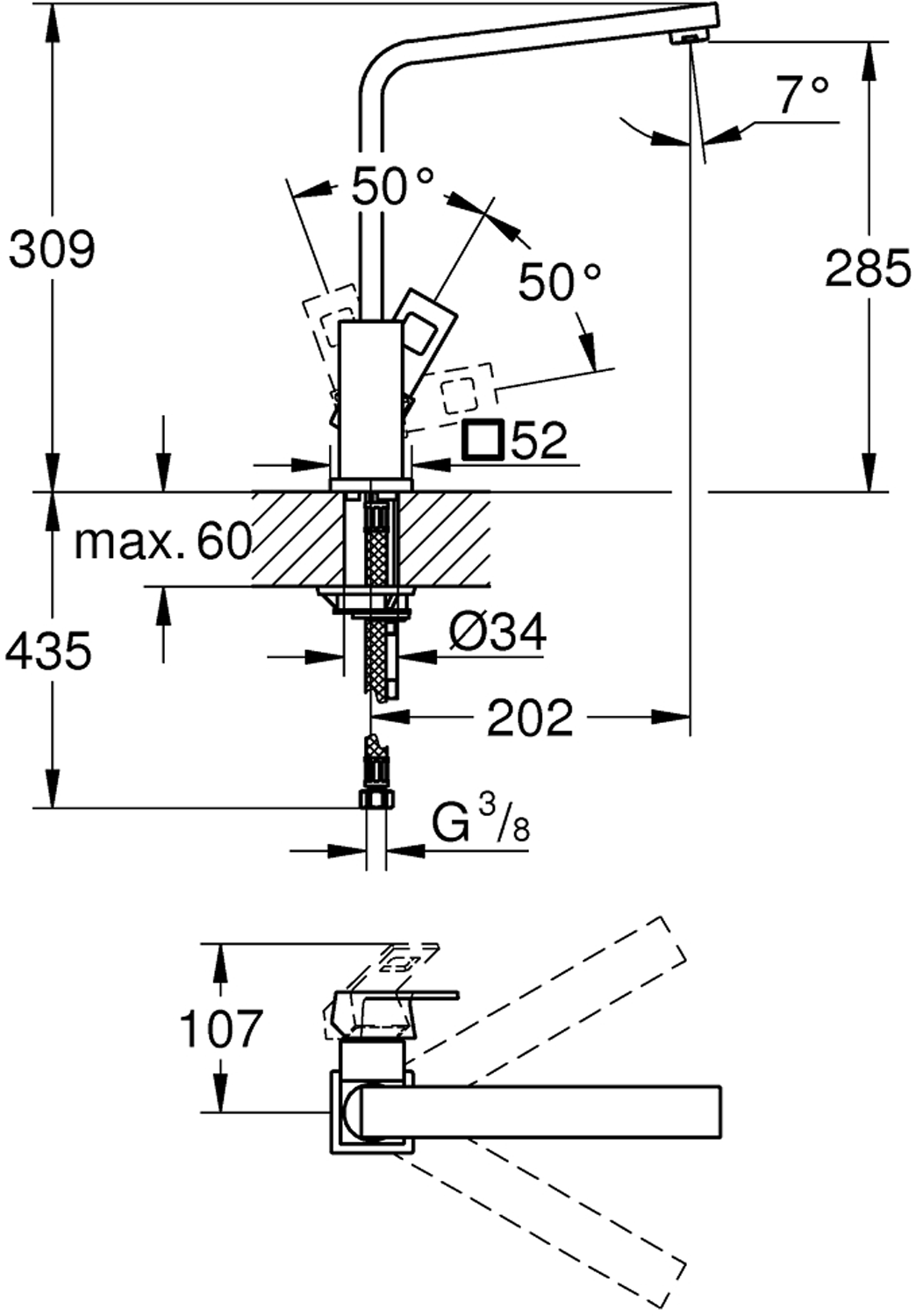 høy tutetthullsmontasjeGROHE StarLight-overflateGROHE SilkMove 28 mm keramisk patronperlatorsvingbar tutsvingradius 360°fleksible tilkoblingsslangerhurtig-montasje-systemmin. trykk 1.0 barVann- og avløpsinstallasjoner må installeres av rørlegger.