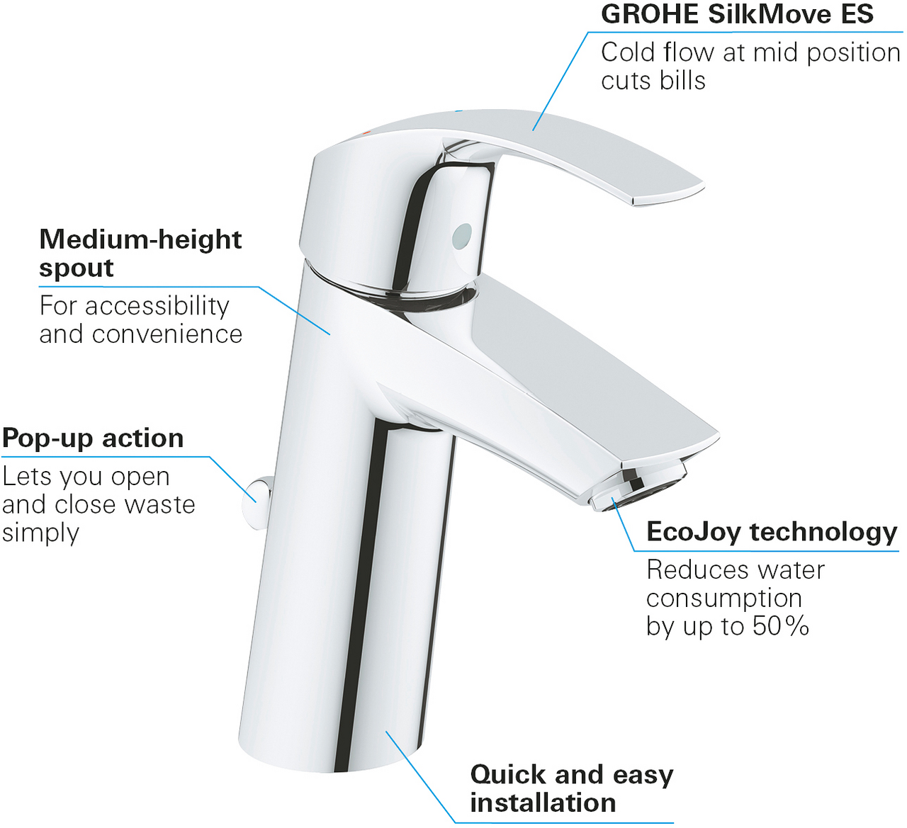 Middels høy tut er praktisk og gir god tilgjengelighetGROHE watersaving® – sparer vann og pengerEnkelt installasjonssystem – gjør det enkelt å installere kranen