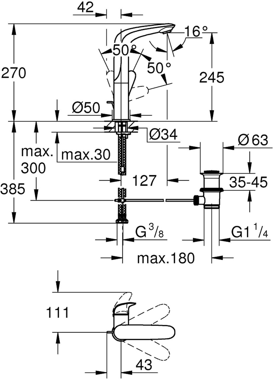 etthullsmontasjesolid metall hendelmed temperaturbegrenserGROHE Long-Life overflateGROHE Water Saving-teknologi for mindre vannforbrukmaximum flow rate (at 3 bar): 5 l/minGROHE FastFixation sørger for rask installeringsvingbar tutsvingradius 360°oppløft med avløpsgarnityr 1 1/4"Vann- og avløpsinstallasjoner må installeres av rørlegger.