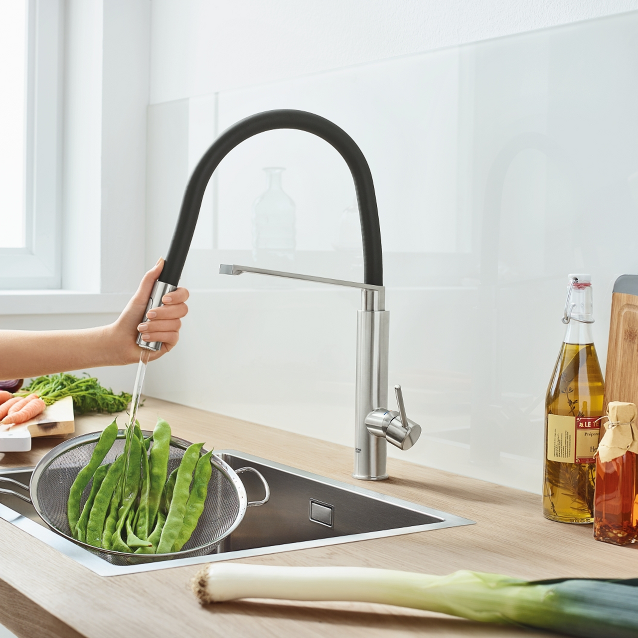 Grohe Feel Professional kjøkkenarmatur er perfekt for deg som foretrekker den industrielle stilen. Tuten kan beveges 360˚ for å nå hvert hjørne av vasken din, mens den profesjonelle sprayen er ideell for rengjøring av grønnsaker, fylling av gryter eller arbeid i en dobbel vask.