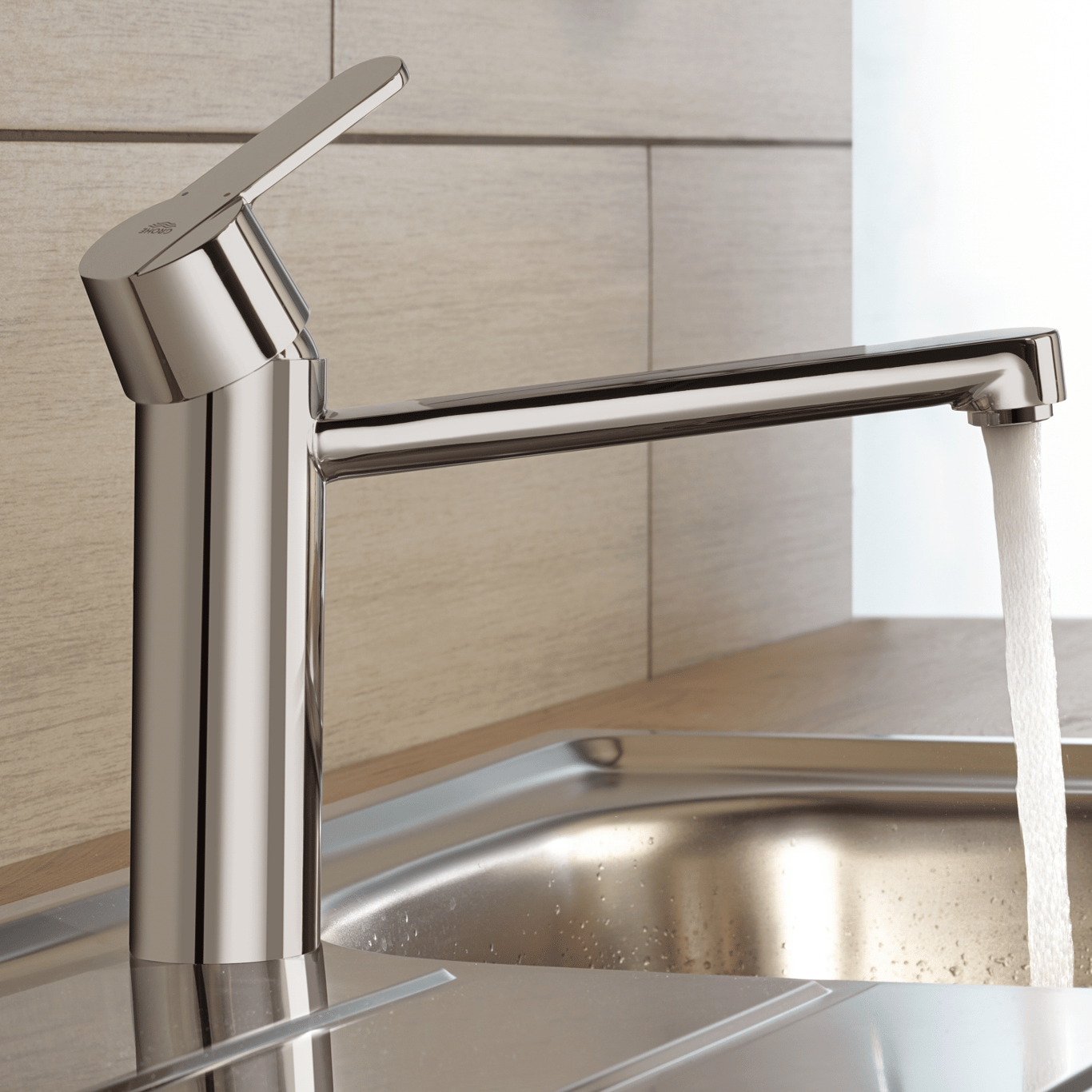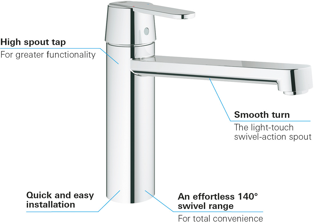 Grohe Get kjøkkenarmatur ha, et Grohe StarLight® belegg som er slitesterkt, ripesikkert og enkelt å holde rent, bare tørk av kranen med en tørr klut.