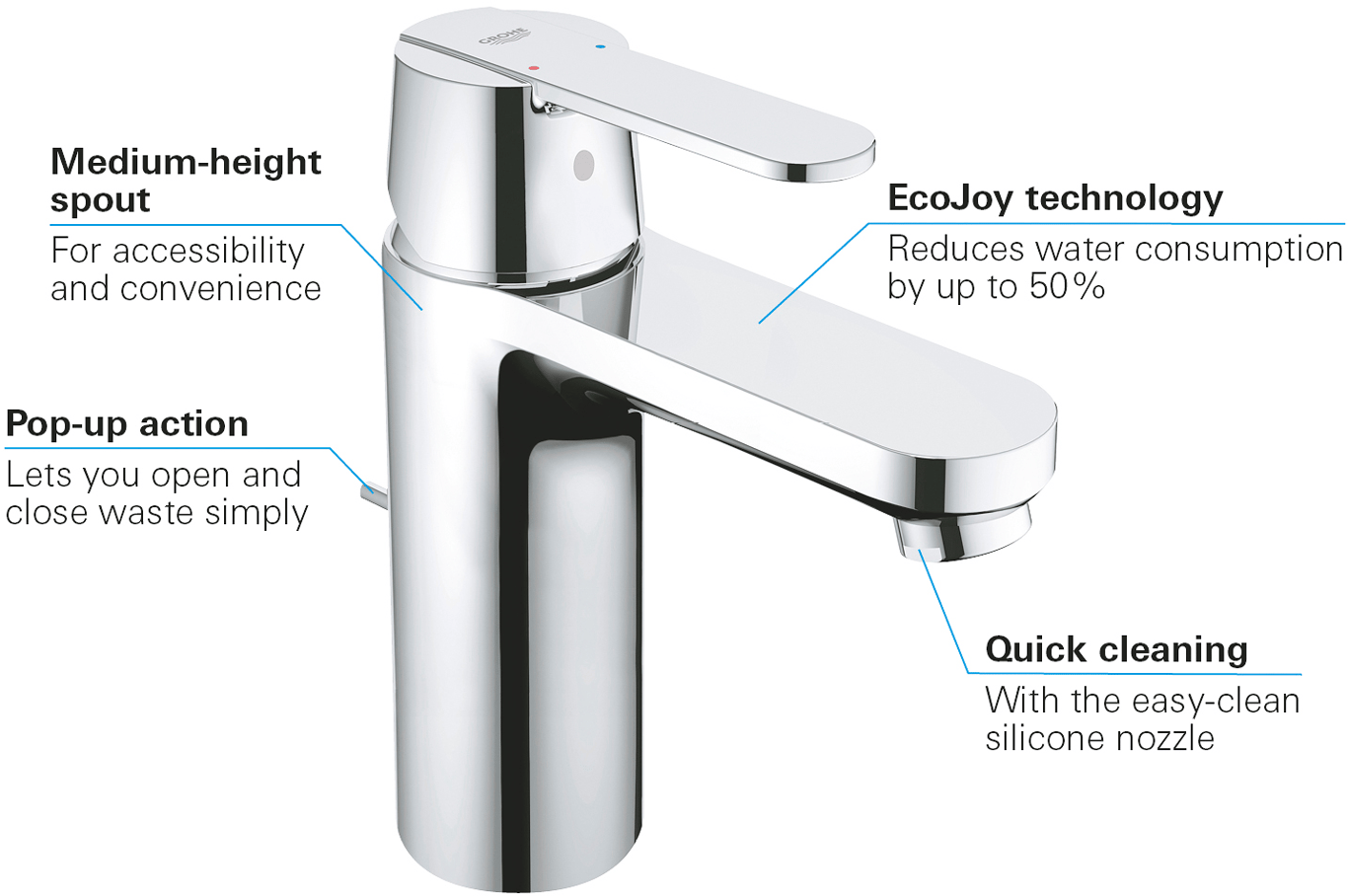 SpeedClean-teknologi – enkel, rask og renMiddels høy tut er praktisk og gir god tilgjengelighetGROHE watersaving® – sparer vann og penger