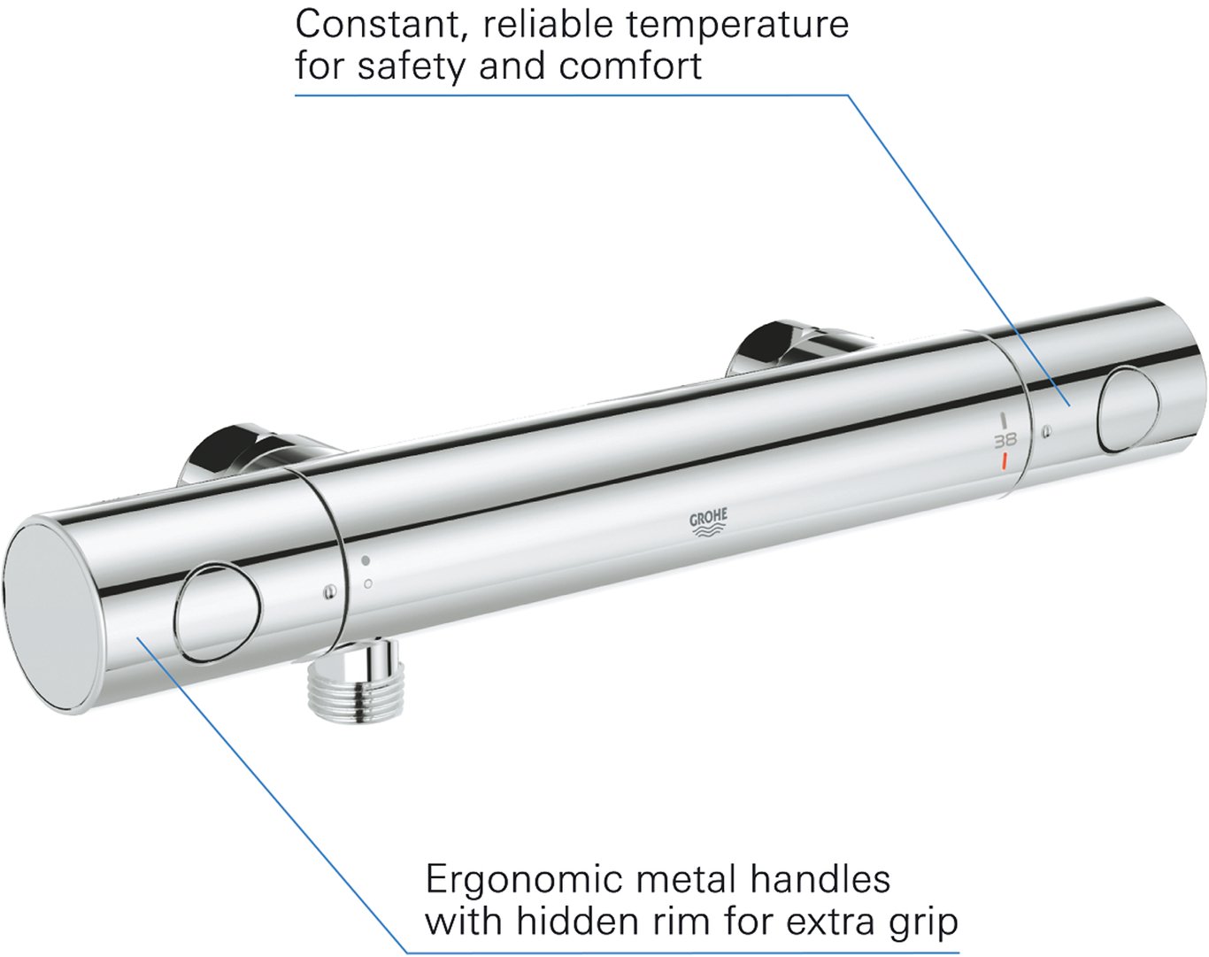 veggmontasjeGROHE StarLight krom overflateGROHE MetalGrip ergonomisk formet metallhåndtakGROHE SafeStop ved 38°CGROHE SafeStop Plus valgfri temperaturbegrensning på 43°C inkludertGROHE TurboStat kompakt patronmed voks termoelementintegrert blandesperrereguleringsgrep med GROHE EcoButton(individuell EcoButton justeringsstopp)keramisk overdel 1/2", 180°innbygget tilbakeslagsventilerdusjuttak bunn 1/2"silermed tilbakeslagsventiluten tilslutningerGROHE watersaving-teknologi for mindrevannforbrukVann- og avløpsinstallasjoner må installeres av rørlegger.
