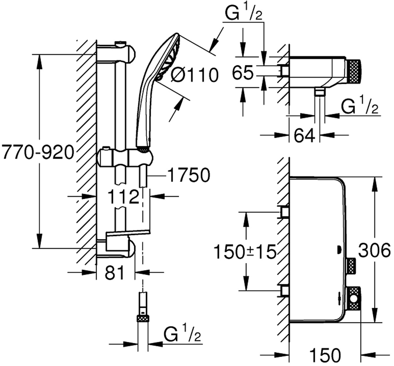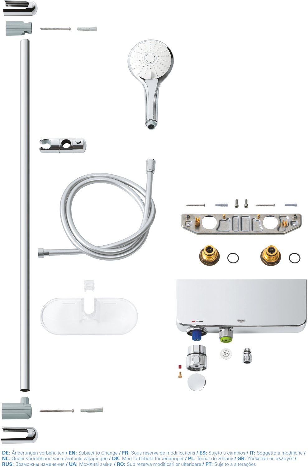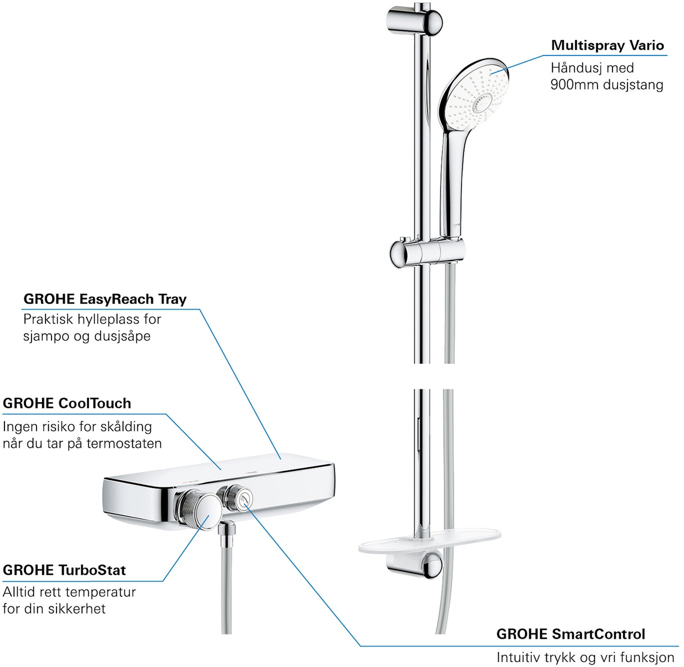 består av:Grohtherm SmartControl termostatisk dusjmikser (34 719 000)Euphoria 110 Massage dusjsett, 900 mm (27 226 001)Vann- og avløpsinstallasjoner må installeres av rørlegger.