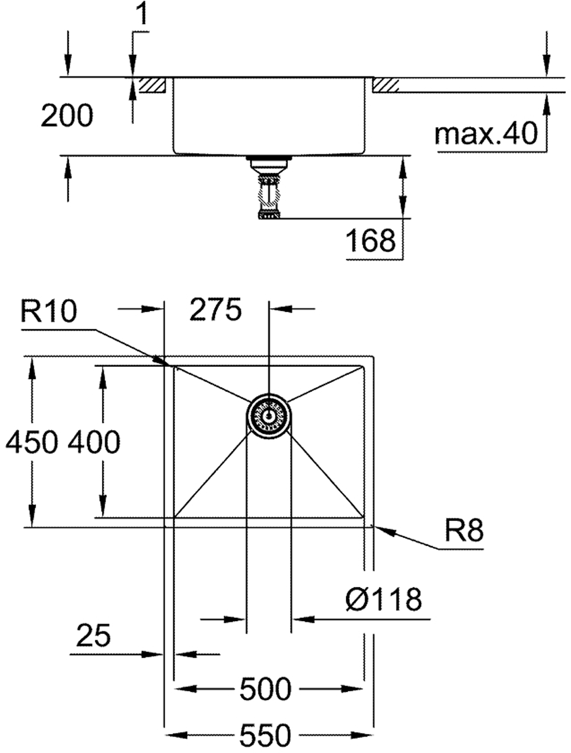 modell: K700 60-S 55/45 1.0monteringstype: undermontering, toppmontering eller innfelt monteringmateriale: rustfritt stål AISI 304 (V2A)materiale tykkelse: 1 mmGROHE StarLight-overflateoverflate: satin-overflateGROHE Whispermin. skapstørrelse: 600 mmdimensjoner: 550 x 450 mm1 kum: 500 x 400 x 200 mmytre radius: R11 (undemontering)/R3 (toppmontering), indre kum radius: R10GROHE FastFixation sørger for rask installeringutskjæring (undermontering): 502 x 402 mm (R11)utskjæring (toppmontering): 535 x 435 mmavløp: Ø 3.5"/90 mm stålsilinkluderer tilbehør: avløpsgarnityr, stålsil, monteringssettmulighet for: avløpsgarnityr med trykkontroll (40 986 SD0)antall fester inkludert (topplimt): 8antall fester inkludert (underlimt): 8Vann- og avløpsinstallasjoner må installeres av rørlegger.