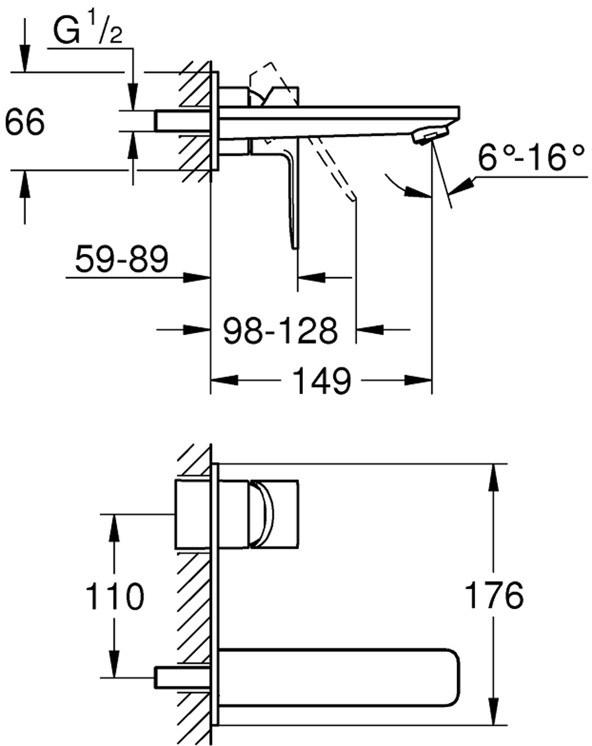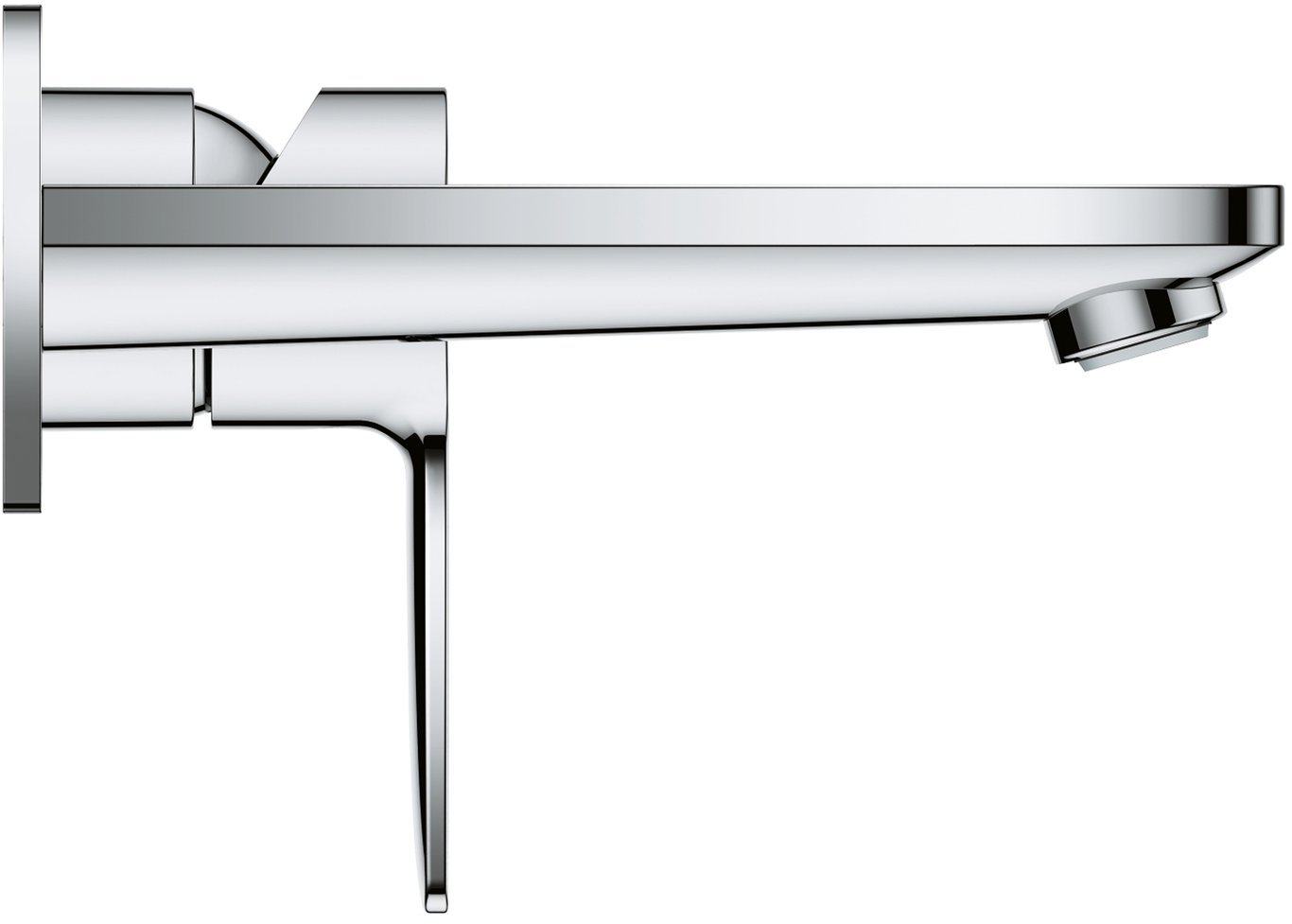 Dette servantbatteriet fra Grohe har et moderne design, med rette linjer og en overflate i krom. Den veggmonterte kranen gir sammen med en frittstående servant en moderne helhet på badet.