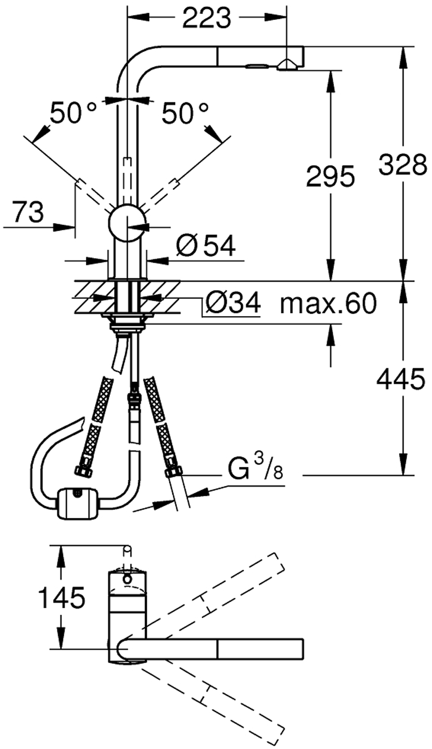 L-tutetthullsmontasjeGROHE StarLight-overflateGROHE SilkMove 46 mm keramisk patronflytbegrenserUttrekkbar spraykontroll - bytter frem og tilbakemellom vanlig vannstrøm og spraystråleomstiller: laminar spray / SpeedClean jet-dusjautomatisk tilbakestilling til laminar spraymetall dusjtutvariable justerbar volumbegrensersvingbar rørtutsvingradius 360°integrert tilbakeslagsventilmed tilbakeslagsventilfleksible tilkoblingsslangerhurtig-montasje-systemVann- og avløpsinstallasjoner må installeres av rørlegger.