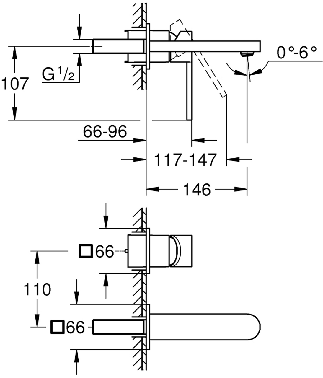 veggmontasjetilhørende innvendig del:23 200uten innbygningsdelerrosett i metallmetallhendelGROHE Long-Life overflateGROHE Water Saving-teknologi for mindre vannforbrukmaximum flow rate (at 3 bar): 5 l/minSpeedClean mousseurGROHE AquaGuide justerbar perlatorsenteravstand 110 mmfremspring 147 mmmin. trykk 1.0 barVann- og avløpsinstallasjoner må installeres av rørlegger.