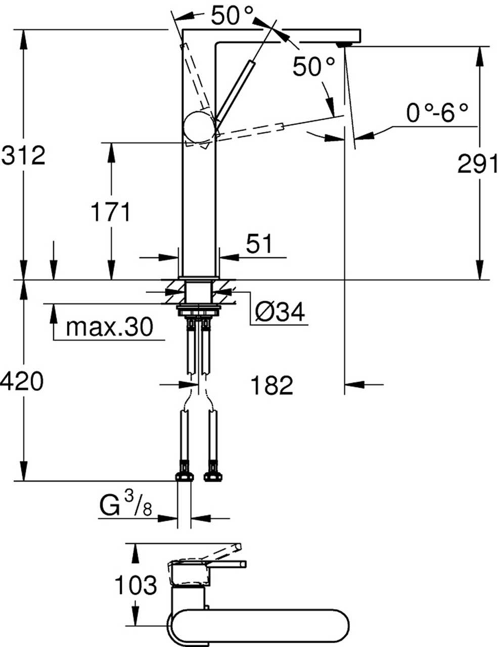 etthullsmontasjemetallhendeltil frittstående servantGROHE SilkMove 28 mm keramisk patronmed temperaturbegrenserGROHE Long-Life-overflateGROHE Water Saving-teknologi for mindre vannforbrukmaximum flow rate (at 3 bar): 5 l/minSpeedClean mousseurGROHE AquaGuide justerbar perlatorrask installasjonglatt kroppfleksible tilkoblingsslangerVann- og avløpsinstallasjoner må installeres av rørlegger.