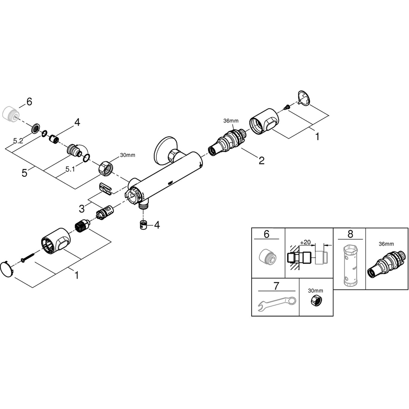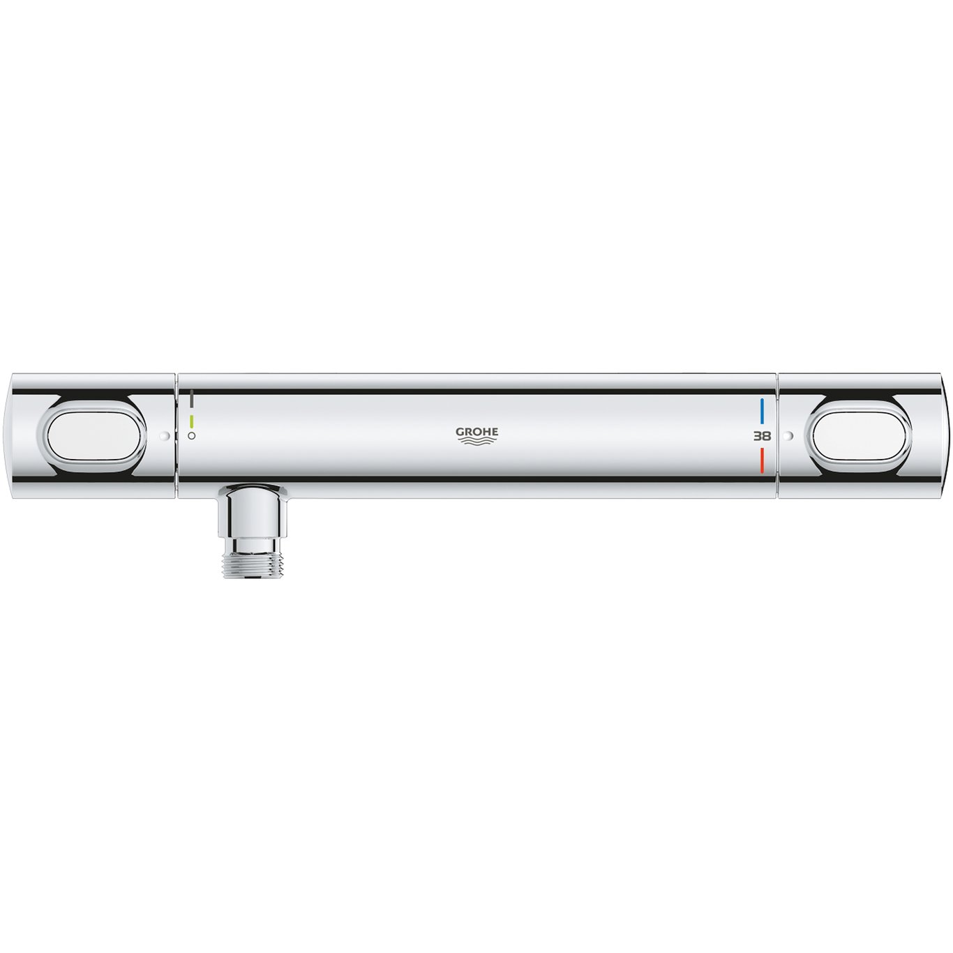 veggmontasjeGROHE Long-Life Shine overflateGROHE SafeStop ved 38°CGROHE SafeStop Plus valgfri temperaturbegrensning på 43°C inkludertGROHE termostatisk patron med termoelementintegrert blandesperrevolumhendel med GROHE EcoKnappheadpart 90°dusjuttak bunn 1/2"innbygget tilbakeslagsventilersilermed tilbakeslagsventiluten rosetteruten tilslutningerGROHE Water Saving-teknologi for mindre vannforbrukVann- og avløpsinstallasjoner må installeres av rørlegger.