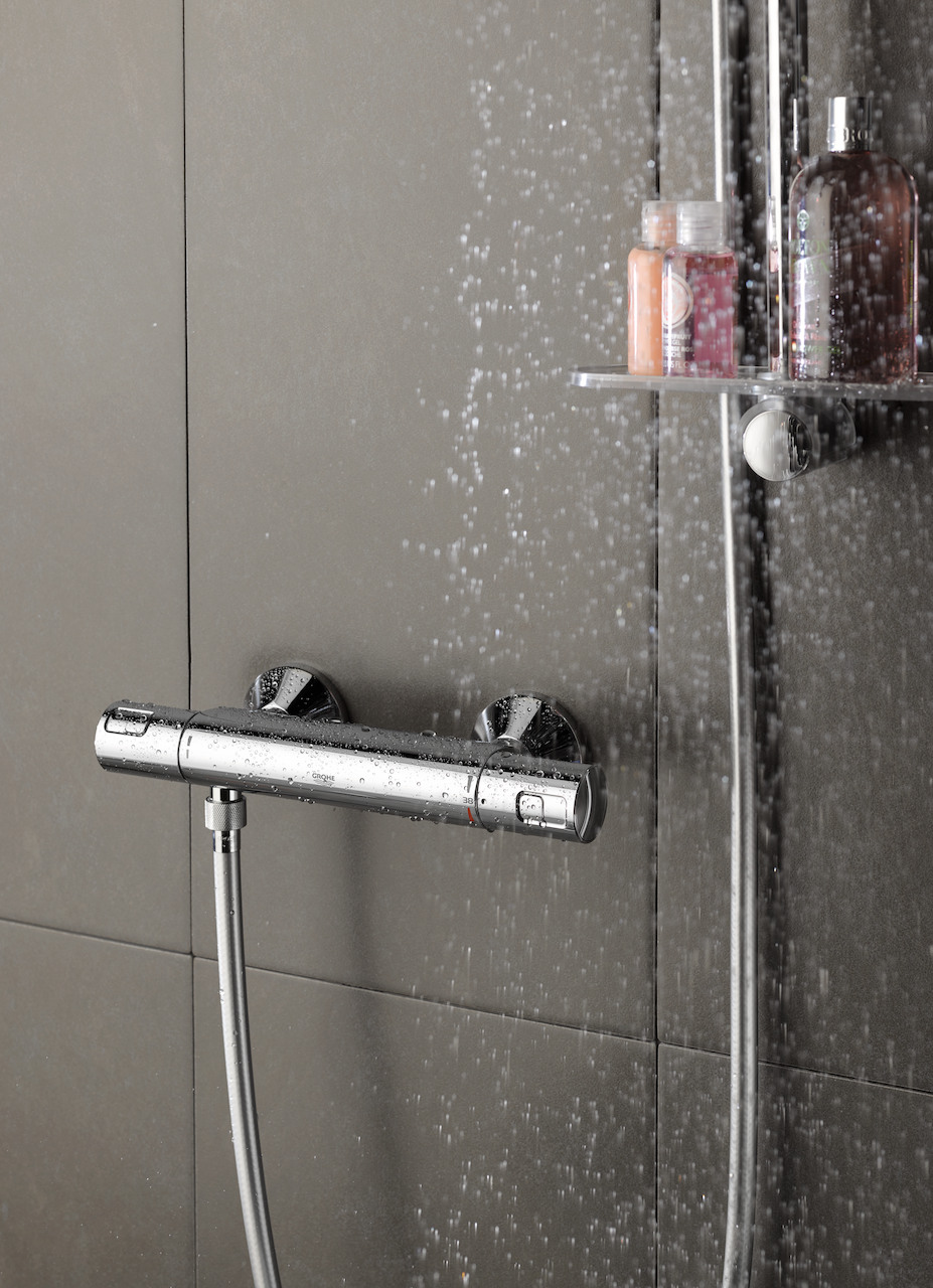 Denne dusjtermostaten fra Grohe leverer umiddelbart ønsket temperatur, og forhindrer ønskede temperatursvingninger. Du kan også enkelt redusere vannforbruket i dusjen ved å trykke på den integrerte Grohe EcoButton.