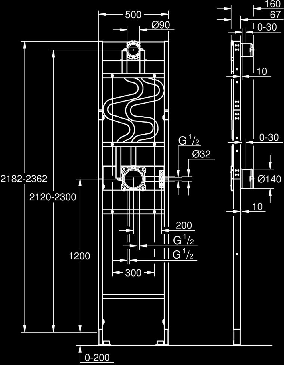 Vannmengde per stråletype (hodedusj): maks 9,5 l/minAntall stråletyper på hodedusj: 2Antall inntak (Rainshower Universal-boks): 2Antall inntak (Rapido SmartBox): 2 nedre inntakInstallasjonsdybde (råvegg til front på ramme): minimum 67 mmTotal dybde (råvegg til ferdig vegg): justerbar mellom 77 mm og 107 mmJusterbar høyde på hodedusjuttak: opptil 180 mmGjenger: 1/2" utvendigeKompatible innbyggingssystemer: Grohtherm 1039970000 og 1039980000Veggfester (ved utenpåliggende montering): varenummer 1039999990Mål ramme (H x W x D): 2300 x 500 x 172 mmVann- og avløpsinstallasjoner må installeres av rørlegger.