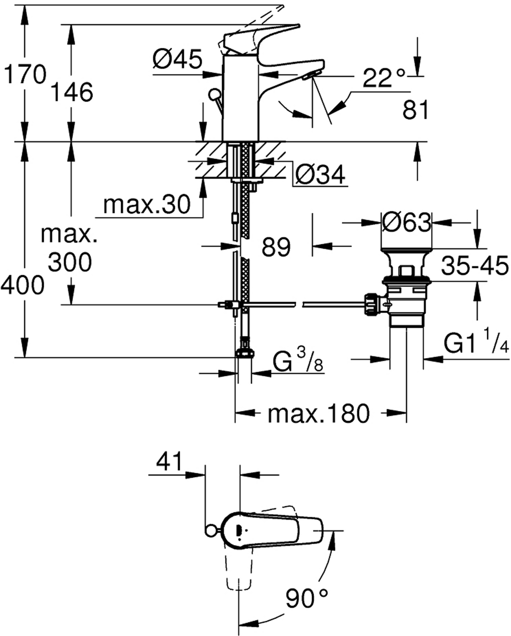 etthullsmontasjemetallhendelGROHE Long-Life ES Kaldstart 28 mm keramisk patron med energisparende funksjon via kaldstartGROHE Long-Life overflateGROHE Water Saving perlator 5,7 l/minrask installasjonoppløft med avløpsgarnityr 1 1/4"fleksible tilkoblingsslangerVann- og avløpsinstallasjoner må installeres av rørlegger.