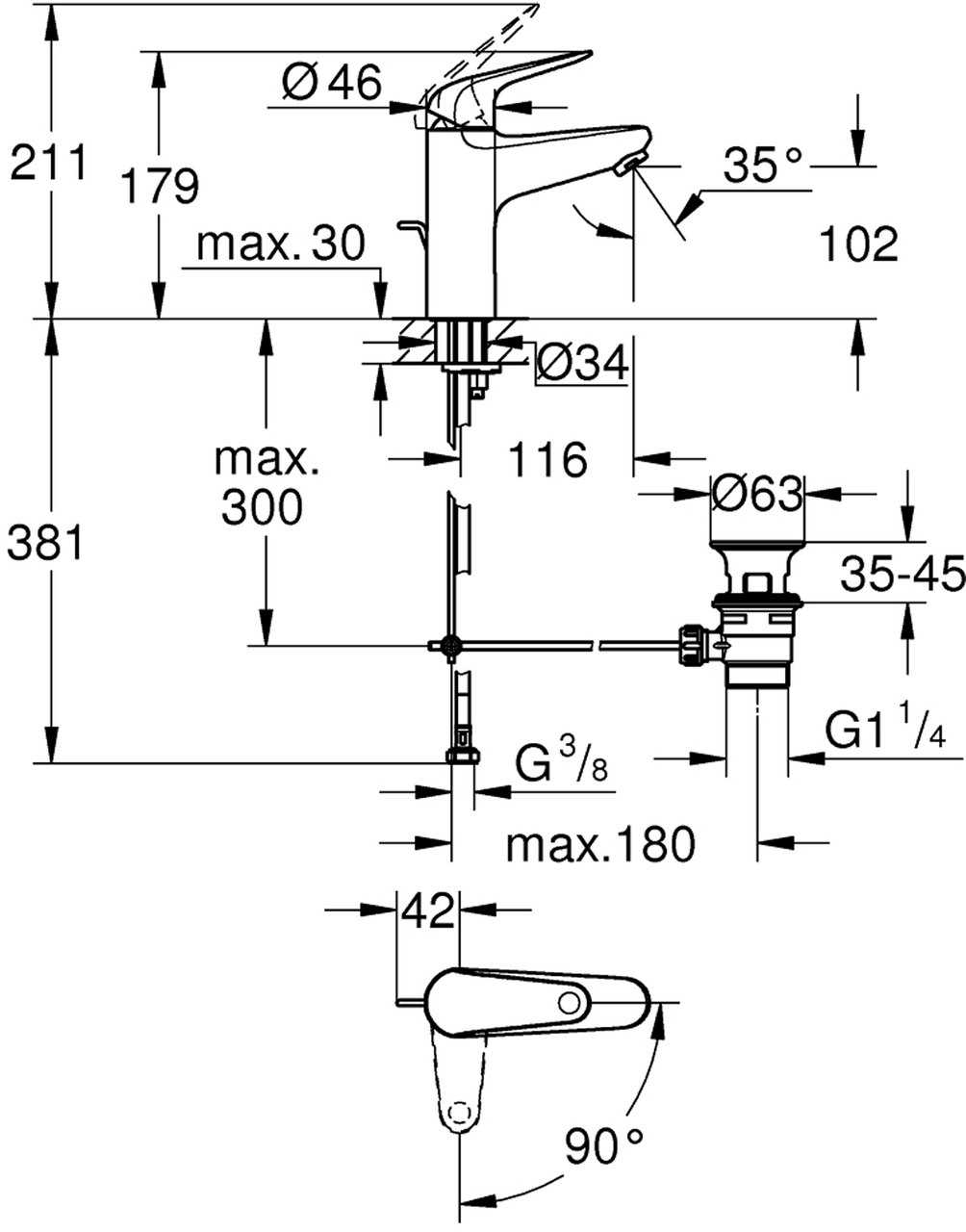 etthullsmontasjemetallhendelGROHE Long-Life ES Kaldstart 28 mm keramisk patron med energisparende funksjon via kaldstartmed temperaturbegrenserGROHE Long-Life overflateinnvendig isolerte vannveier - bly- og nikkelfriGROHE Water Saving-teknologi for mindre vannforbrukrask installasjonoppløft med avløpsgarnityr 1 1/4"fleksible tilkoblingsslangerVann- og avløpsinstallasjoner må installeres av rørlegger.