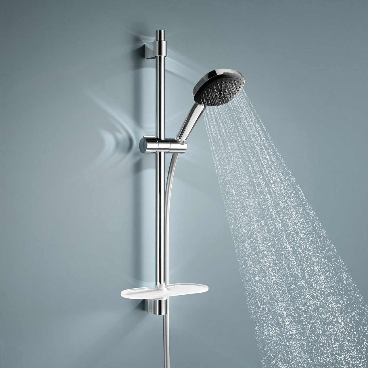 Dette dusjsettet fra Grohe kommer med hånddusj, dusjstang og dusjslange, samt en dusjhylle for praktisk oppbevaring. Hånddusjen har to strålefunksjoner.