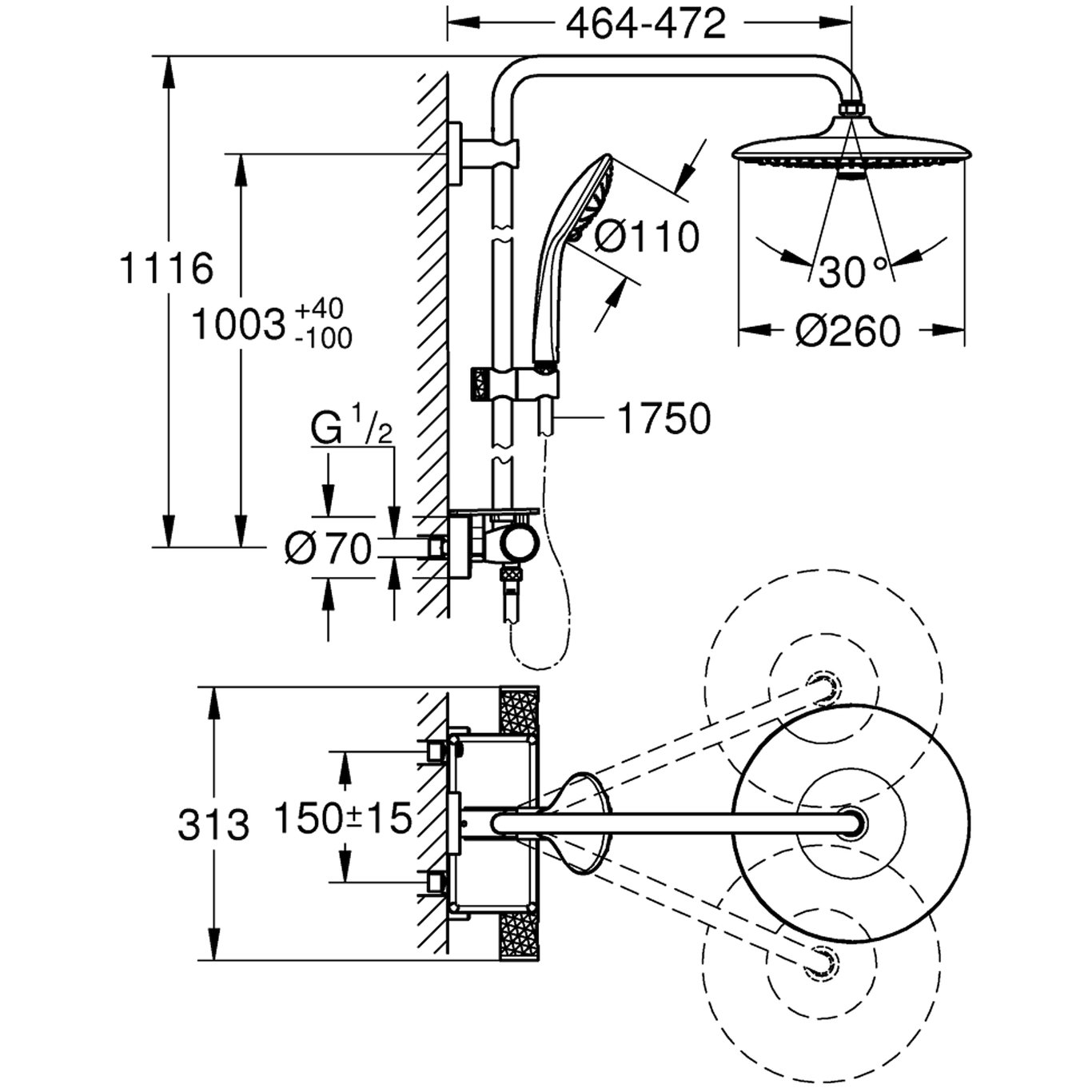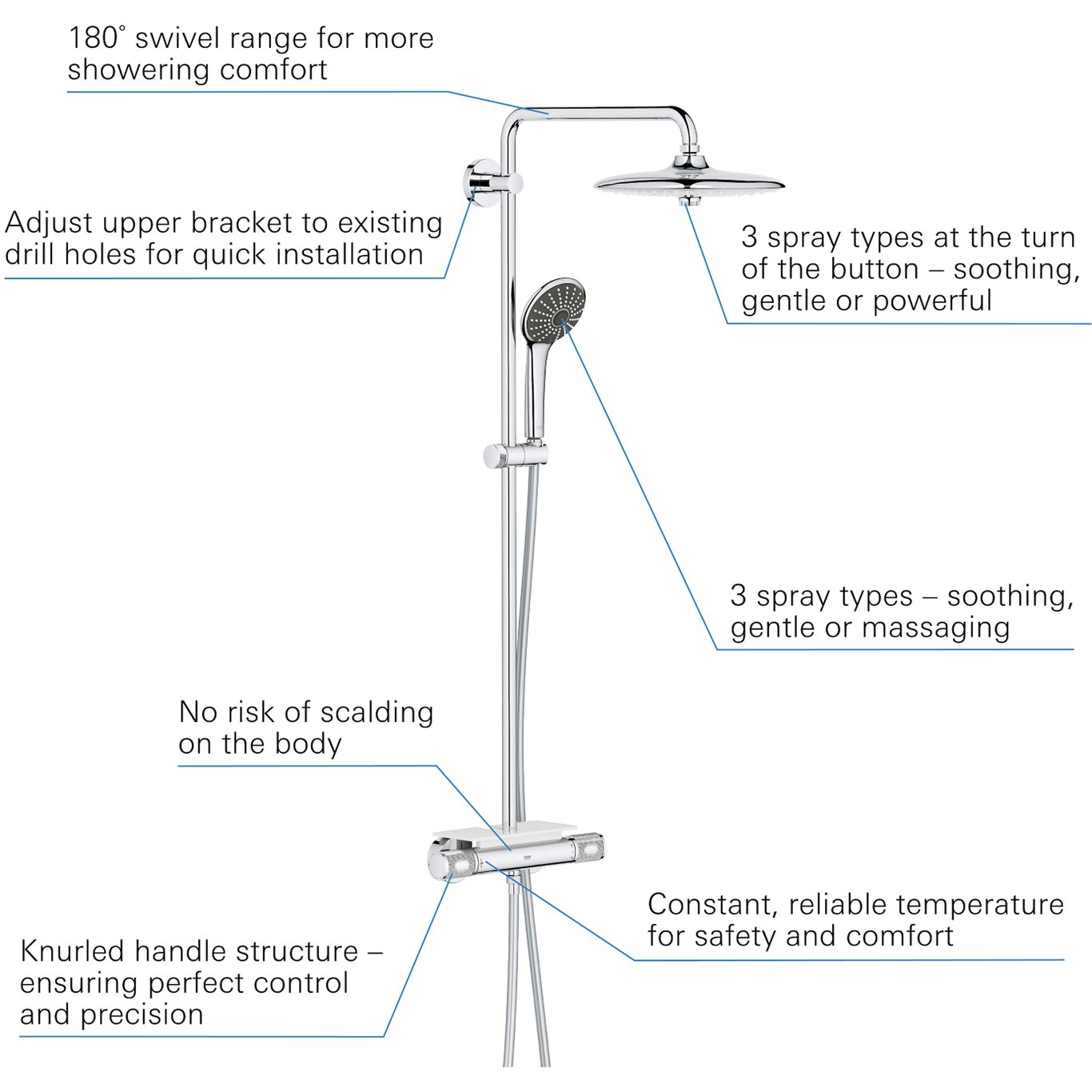 består av:vannrett svingbar 450 mm dusjarmmuliggjør skift mellom:Rain, SmartRain, Jetmed kuleleddrotasjonsvinkel ± 15°3 stråletyperRain, Massage, SmartRainjusterbar i høyde m/glideelementGROHE EasyReach brettGROHE TurboStat kompakt patronmed voks termoelementGROHE SafeStop ved 38°CGROHE SafeStop Plus valgfri temperaturbegrensning på 43°C inkludertGROHE CoolTouch ingen fare for skåldingGROHE ProGrip med en ruglete strukturGROHE DreamSpray perfekt strålemønsterGROHE Long-Life Shine overflateGROHE Water Saving 9,5 l/min gjennomstrømningsbegrenserGROHE SprayDimmer (trinnløs reduksjonav vanngjennomstrømning)GROHE FastFixation øvre feste er justerbartIndre WaterGuide for lengre levetidSpeedClean antikalksystemTwistfree forhindrer at dusjslangen vrir segegnet til gjennomstrømsvarmerfra 18 kW/hminimumsmengde 7 l/min.Vann- og avløpsinstallasjoner må installeres av rørlegger.