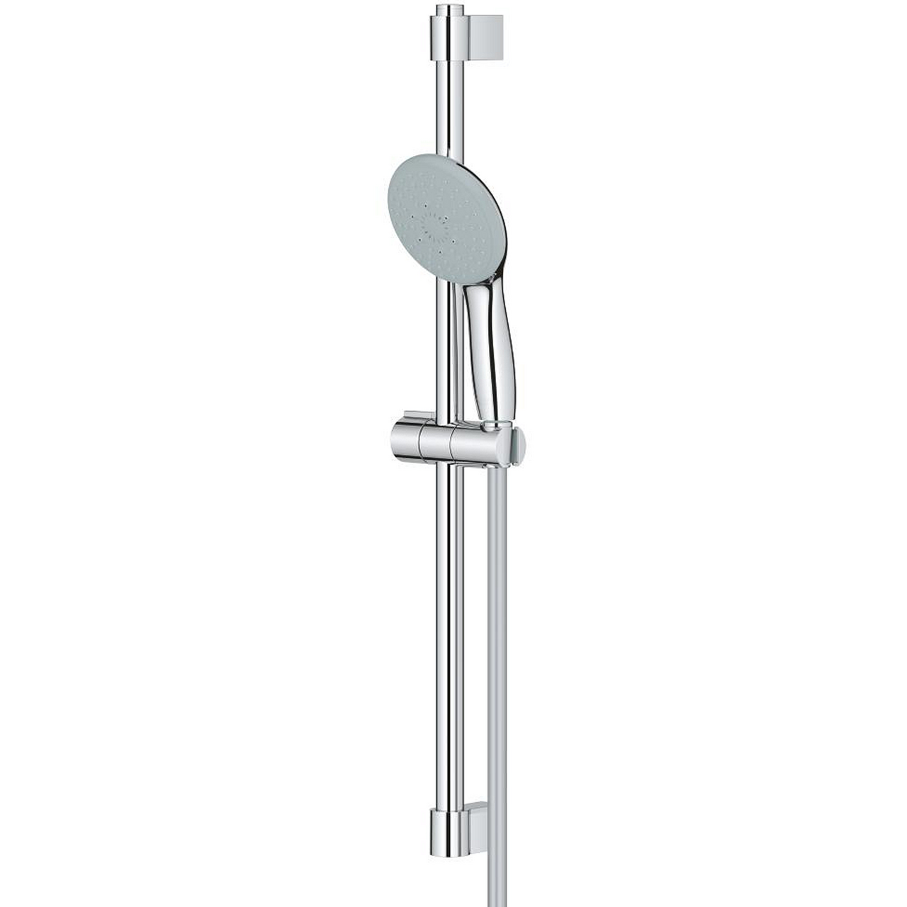 Med Grohe SmartSwitch bytter du enkelt mellom stråletypene ved å rotere på skiven. Grohe DreamSpray sikrer jevn vannfordeling, mens EcoJoy-teknologi reduserer vannforbruket uten at det går utover komforten. Den slitesterke Grohe Long-Life overflaten holder seg blank og lett å rengjøre, og SpeedClean antikalksystem gjør det enkelt å fjerne kalkavleiringer. Dusjstangen har justerbar veggfeste og regulerbar glider, noe som gjør installasjonen fleksibel, også ved eksisterende borehull.