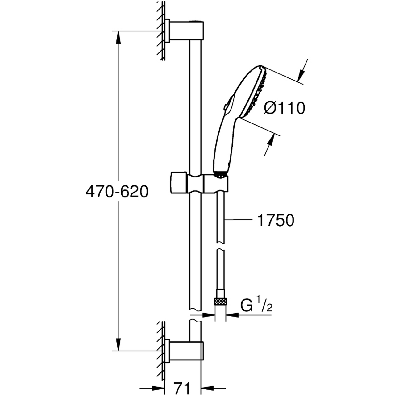 Dusjhodediameter: 110 mmDusjstanglengde: 600 mmJusterbar høyde på glider: ca. 470–620 mmSlangelengde: 1750 mmMaks vannmengde ved 3 bar: 7,4 l/minMinimum driftstrykk: 1,0 barTilkoblingsgjenger: G 1/2"Maks belastning på stang: 20 kgLeverandørens varenummer26966000