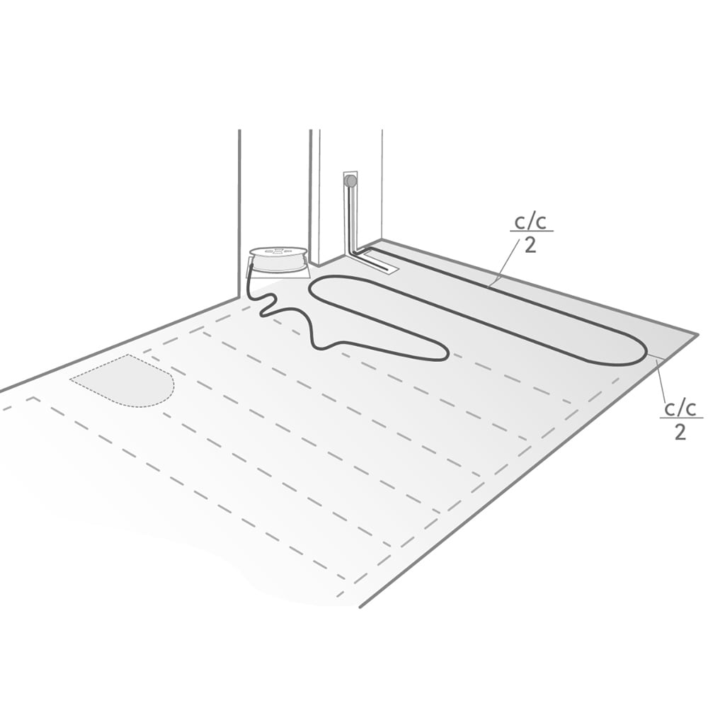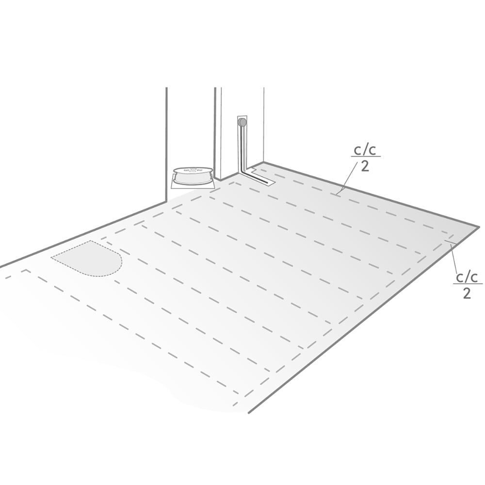 2. Marker varmekabelens c/c-mål. Avstand til vegg skal være sløyfens c/c-mål delt på to.