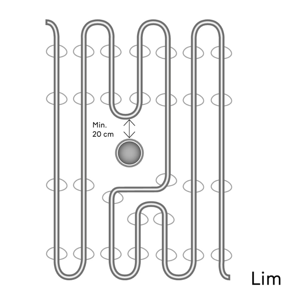 4. Slik skal varmekabelen legges rundt gulvsluk o.l. La det være plass til risten til gulvsluken. Obs! Minst 20 cm avstand mellom sluk og varmekabel!
