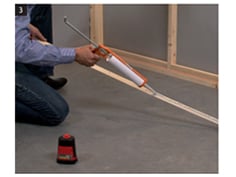 3. Montering av bunnprofilene: Se til at bunnprofilene monteres i vater i hele rommet for å unngå høydeforskjeller mellom panelene. Den beste måten å gjøre det på, er med laserutstyr. Legg fugemasse på baksiden av bunnprofilen.