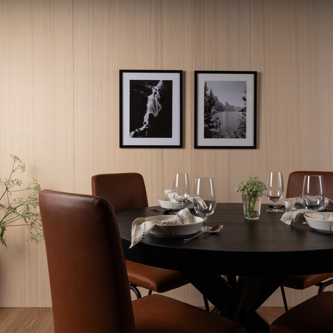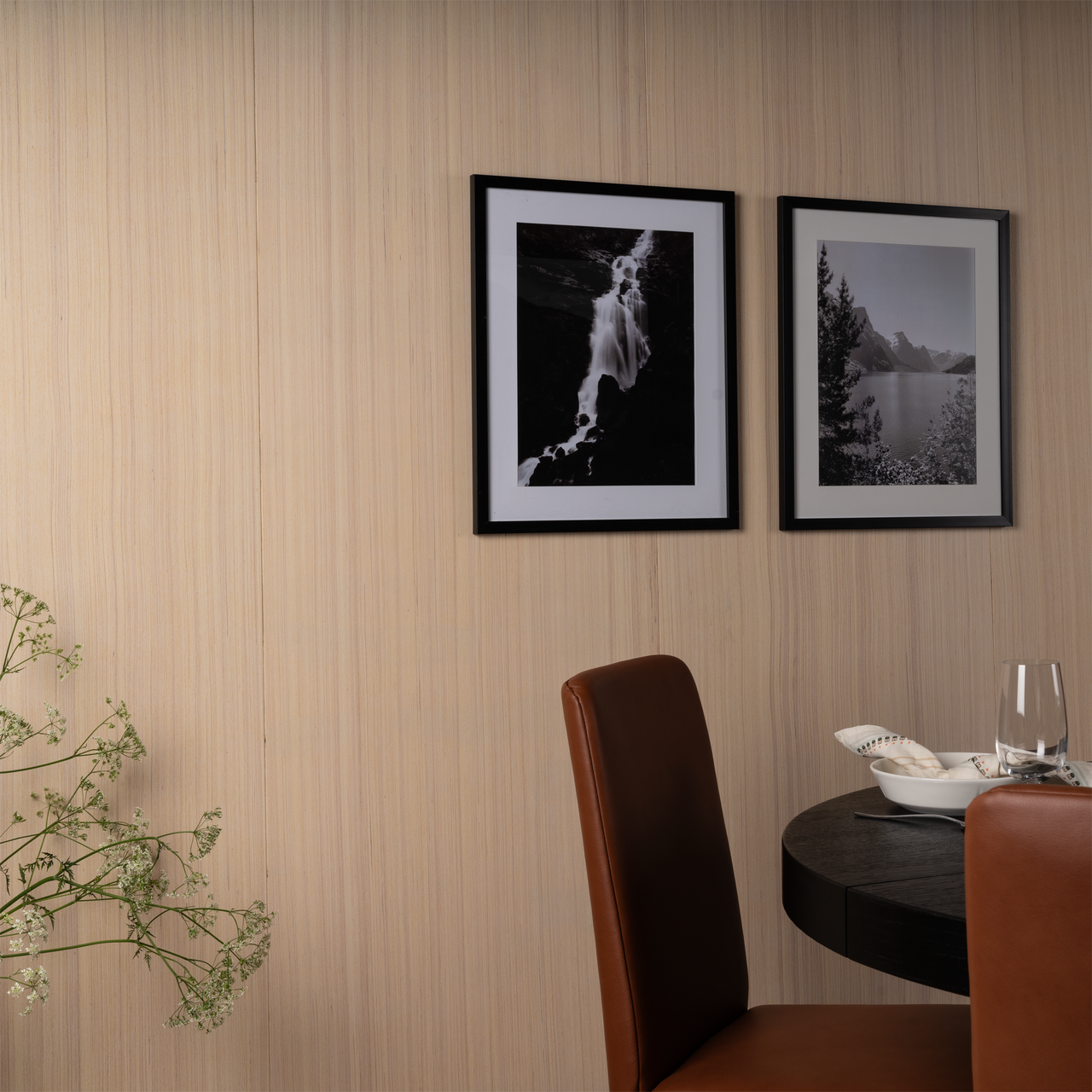 Montering: På veggplatene er det frest not og fjær, og platene festes til vegg eller staver ved å skru inn i pennen skjult. Dersom det, av synsmessige årsaker, er behov for å flytte en plate etter montering gjør skrumonteringen det mulig å demontere platene. Ved å bruke utforing i samme utførelse, skjules avvik inne i sporet om man kapper noe feil eller sagen river opp fineret. Det må benyttes målbånd og merkes før saging av veggplaten. Utforinger og lister kjøpes separat.