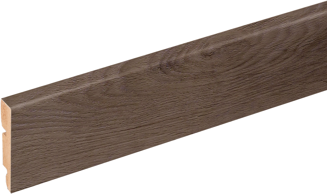 Disse sokkellistene fra BerryAlloc passer til gulv i samme dekor, og gir rommet et helhetlig uttrykk. Listene installeres med lim eller clips.