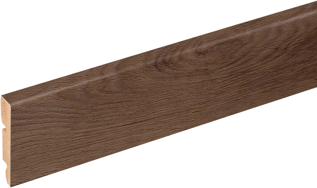 Disse sokkellistene fra BerryAlloc passer til gulv i samme dekor, og gir rommet et helhetlig uttrykk. Listene installeres med lim eller clips.