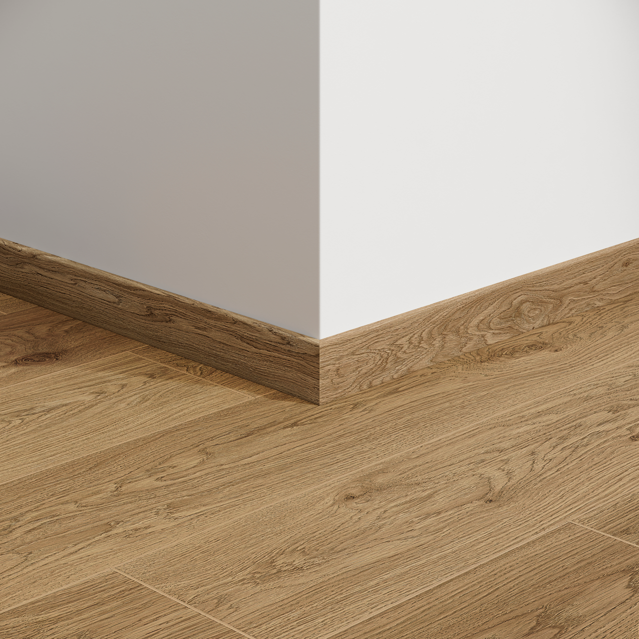 Disse sokkellistene fra BerryAlloc passer til gulv i samme dekor, og gir rommet et helhetlig uttrykk. Listene installeres med lim eller clips.