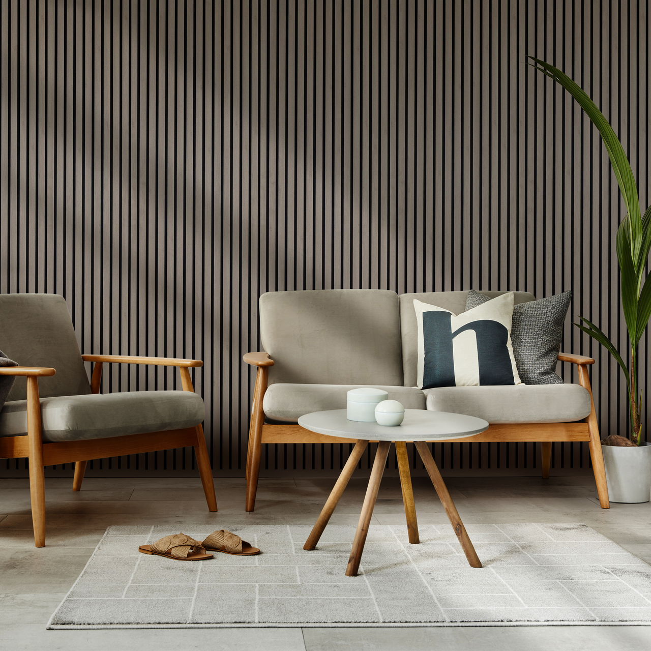 Materiale: plate i nålefilt, spiler i foliert MDFMål, spileelement (H x B): 242 x 60 cmAvstand mellom spilene: 12 mmSpiler: 14 spiler per plateLeverandørens varenummerAP2426022-FSC