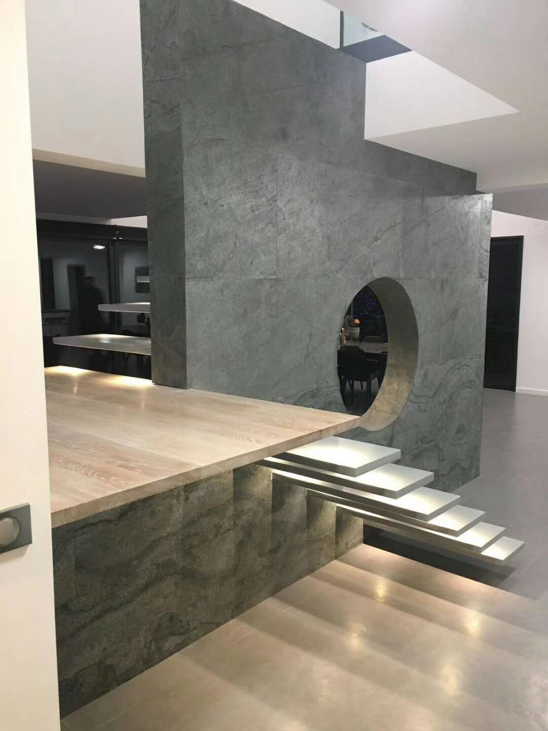 Stein Finér er tynne plater av ekte skifer, som ligner fliser i storformat. Stein finér har en tykkelse på 1-3mm, hvor den består av ett tynt lag av skiferstein som er limt over et glassfiberlag. Dette gjør stein finér både sterkt og fleksibelt. Ikke bare er platen miljøvennlig og ett bærekraftig produkt, men den er også utrolig enkel å montere. Ved hjelp av få redskaper, vil du kunne tilpasse platene til ditt bruk og montere de. Stein finér kan benyttes både innen og utendørs.