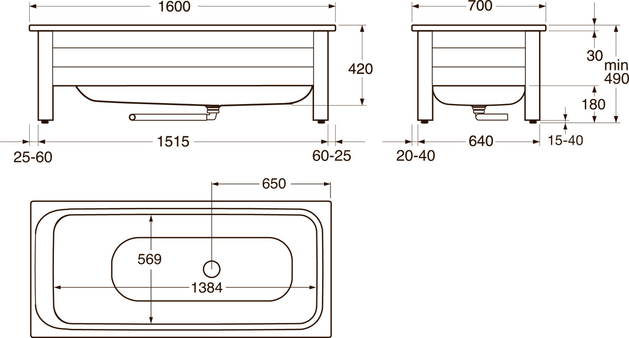 Frontstativ til Gustavsberg sittekar. Badekarfronten leveres med én gavl og én front. Føttene kan justeres 25mm.