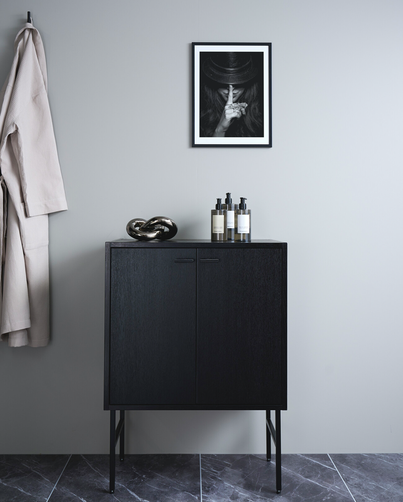 Skapet kan tilpasses med håndtak, og effektbelysning for et unikt uttrykk. Veggskapet er produsert i fuktresistente materialer og er tilgjengelig i både 32 og 39 cm dybde.