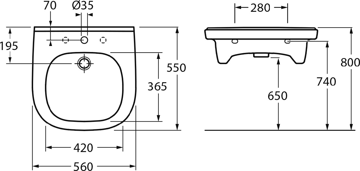 Rullestoltilpasset servant med grunt basseng for boltmontering i vegg.