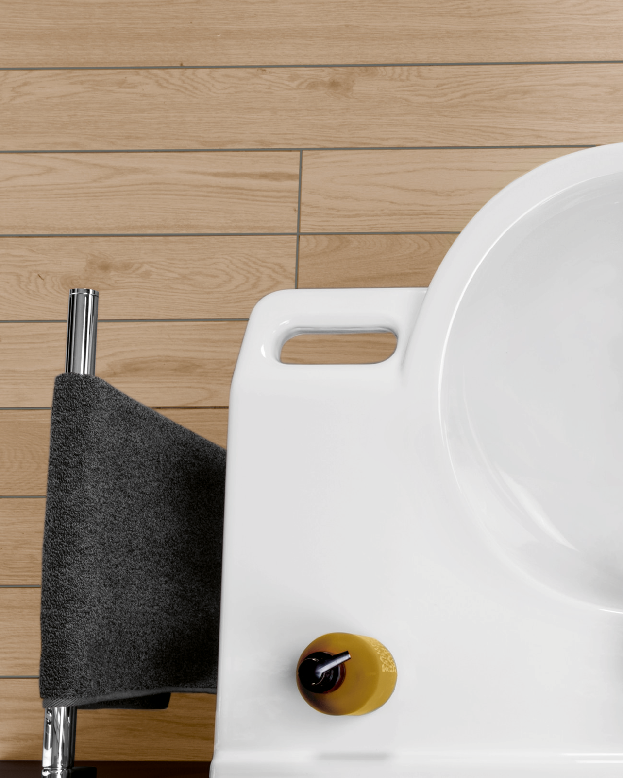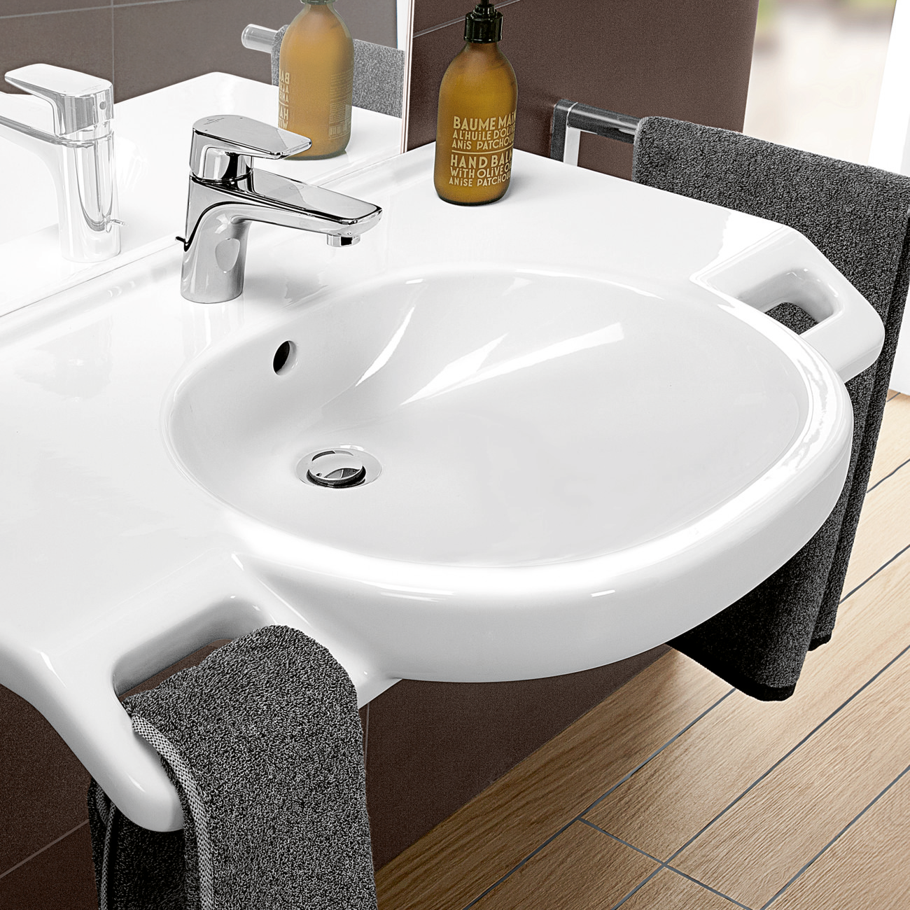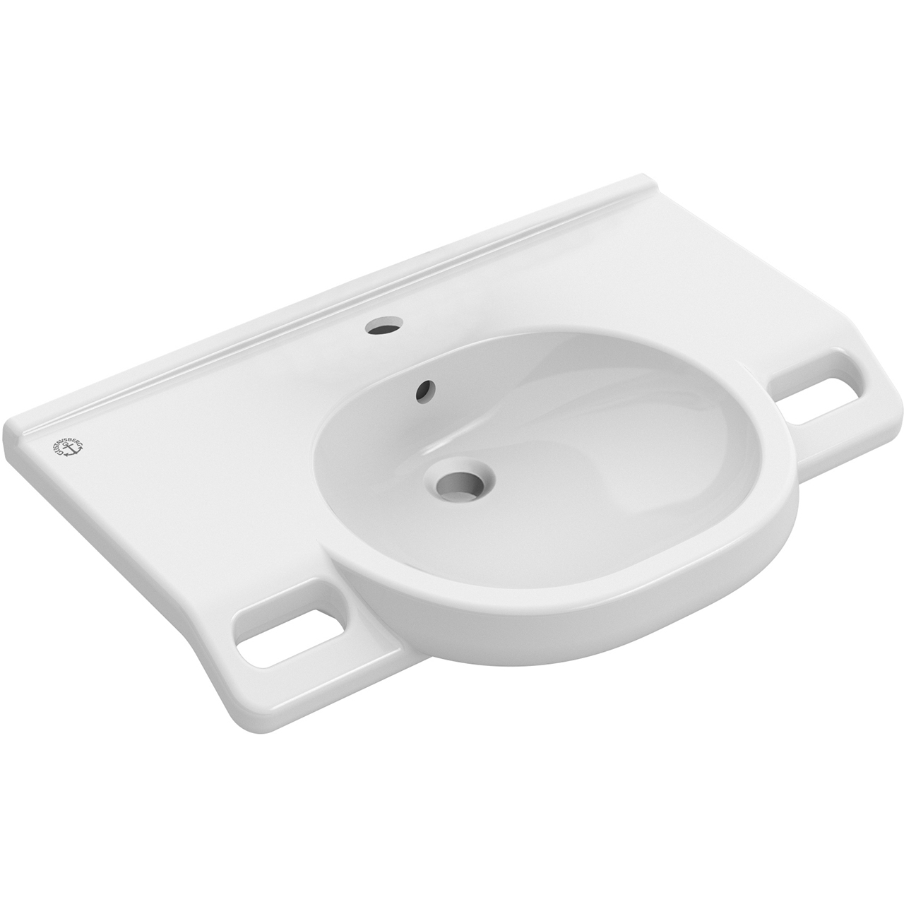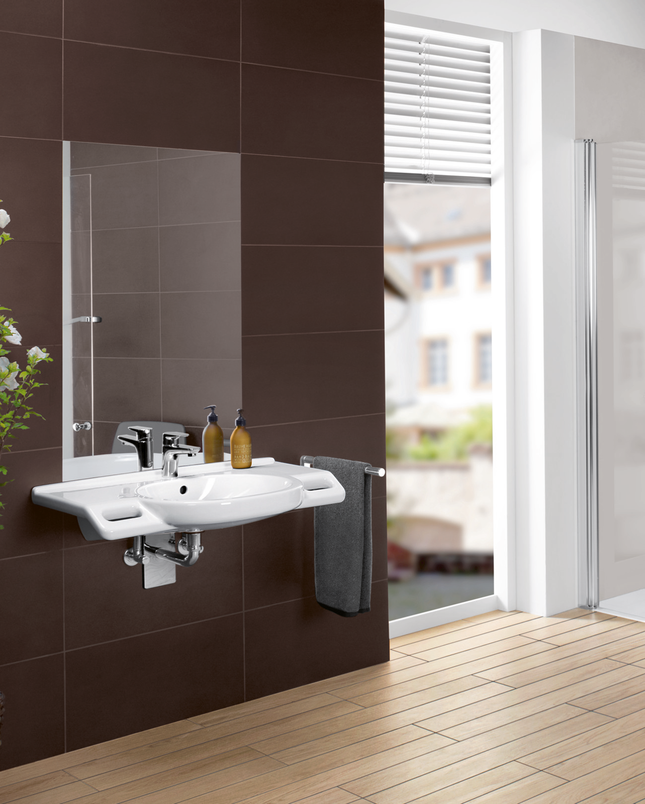 Rullestoltilpasset servant med grunt basseng for boltmontering i vegg.