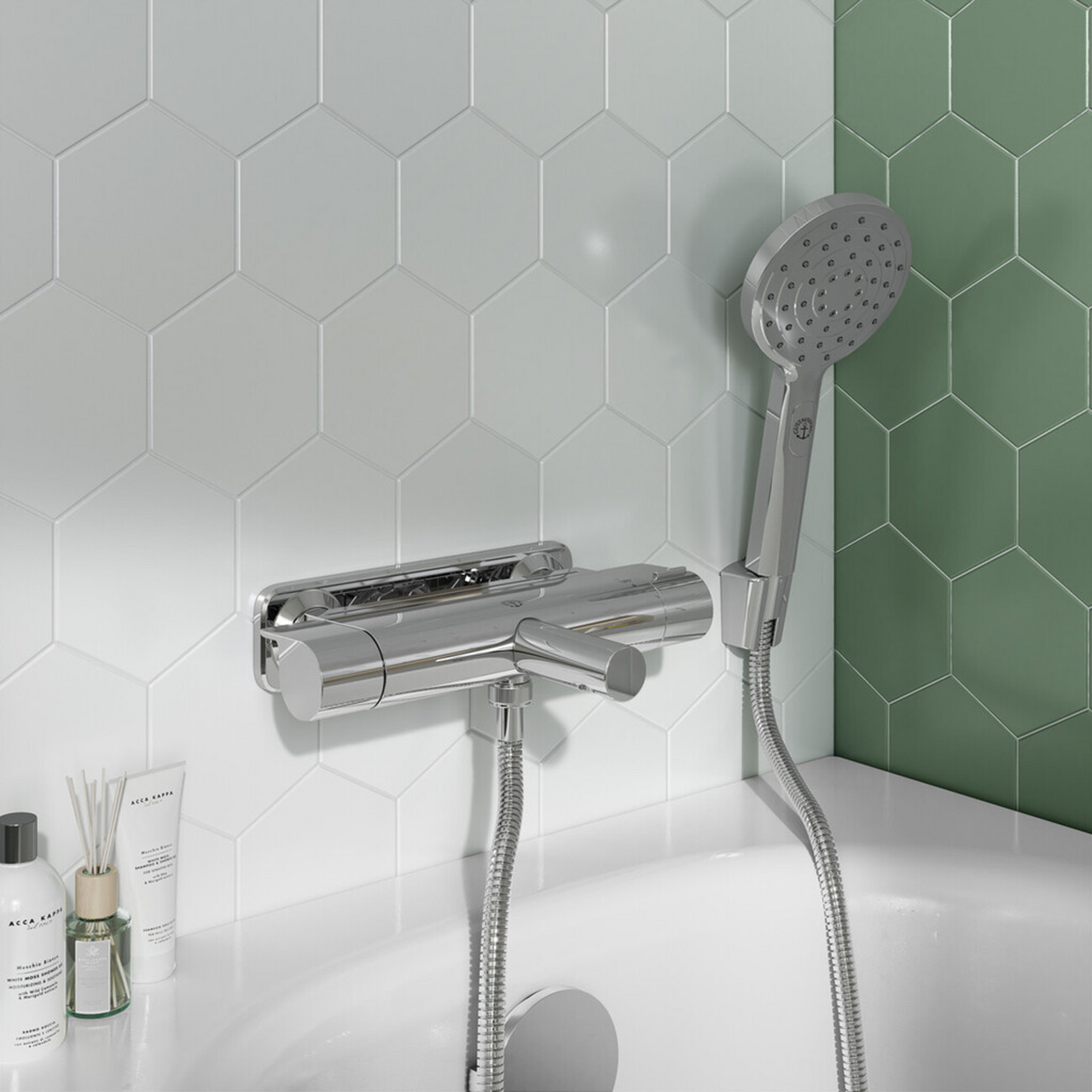 Badekarbatteriet har en knott med tydelig fargemerking for varmt og kaldt vann, samt en integrert automatisk varmtvannssperre for beskyttelse mot skålding. Safe Touch-teknologien minimerer varmen på forsiden av blandebatteriet, og systemet reagerer raskt på trykk- og temperaturendringer i vannstrømmen, noe som gir en jevn vanntemperatur.