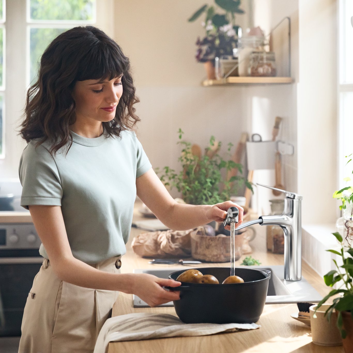 Hansgrohe Zesis M33 160 kjøkkenarmatur har en overflate i krom, og en låsbar dusjstråle som skiftes med trykknapp og stilles automatisk tilbake når armaturet slås av.
