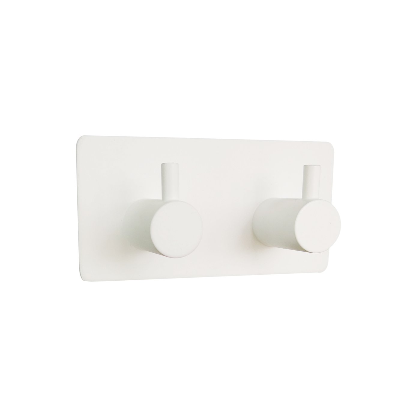 Denne doble knaggen i matt hvit har et minimalistisk design, som gjør at den passer godt inn i de fleste baderom. Den kan enkelt festes til veggen ved hjelp av den selvklebende limflaten på baksiden.