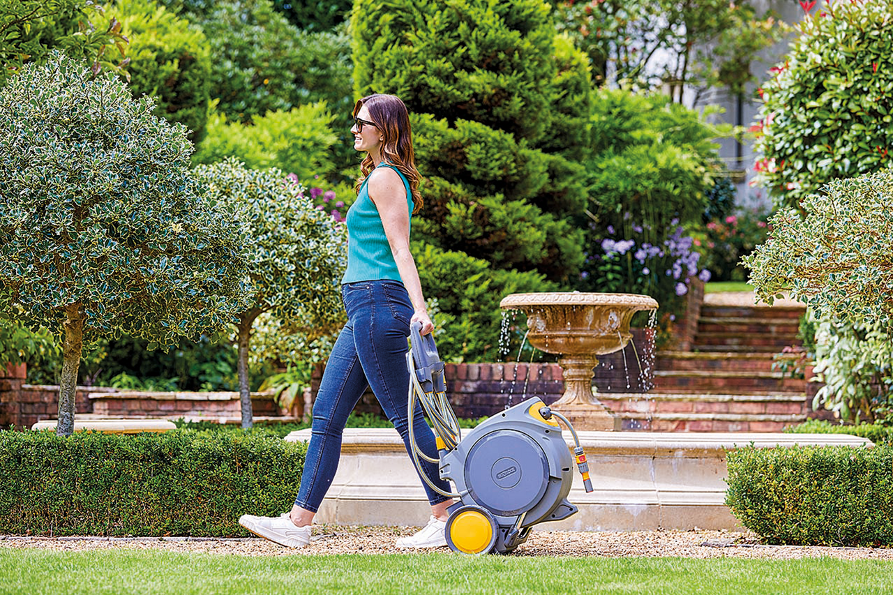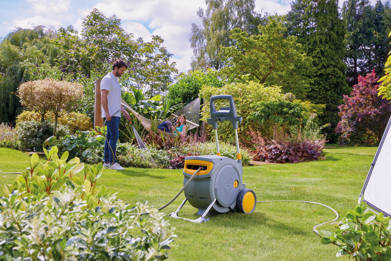 Vognen kommer med praktiske hjul som gjør at du enkelt kan trille den til ønsket plassering i hagen og forankre den ved å brette ut det fremre benet. Det integrerte autowind-systemet sørger for en jevn og kontrollert tilbakesporing av slangen.