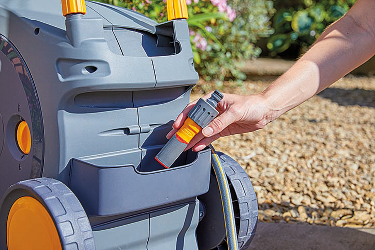 Denne slangevognen fra Hozelock er en praktisk løsning for gartnere som trenger en enkel og automatisert vanning uten å måtte feste noe permanent på ett sted.