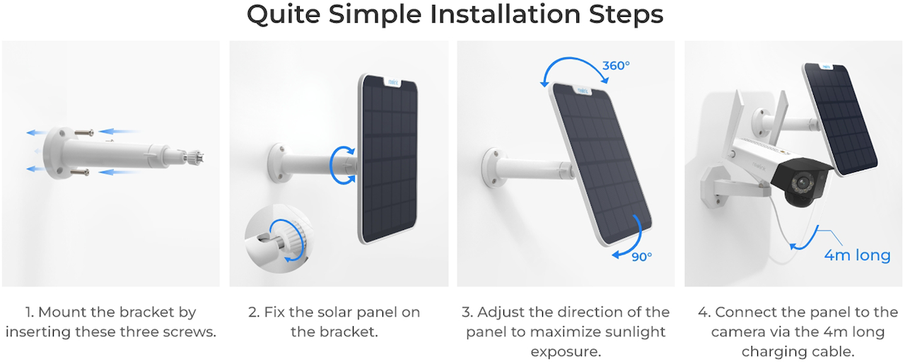 Dette solcellepanelet fra Reolink holder ditt batteridrevne Reolink overvåkningskamera oppladet til enhver tid, og kobles enkelt til kameraet med en medfølgende USB-kabel.
