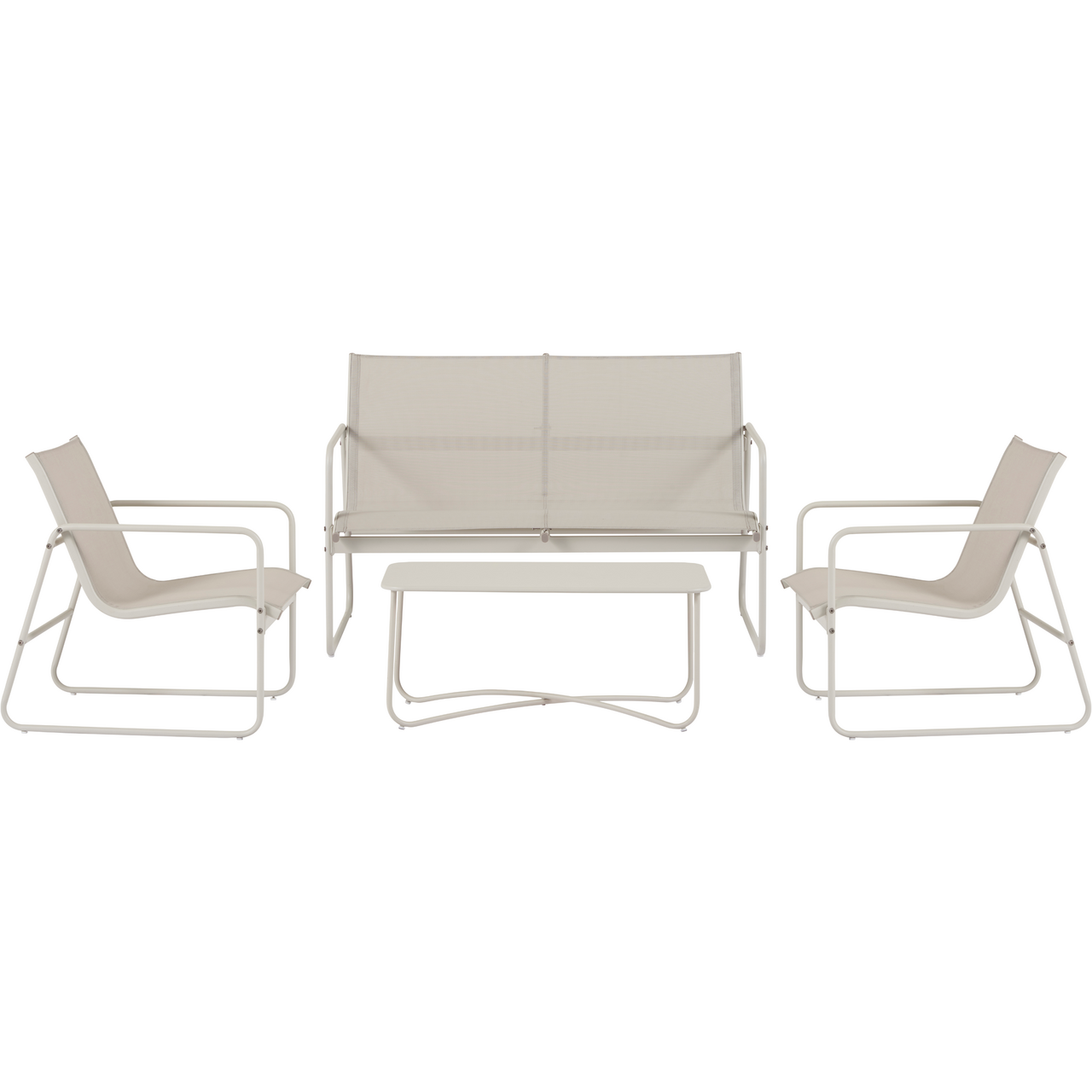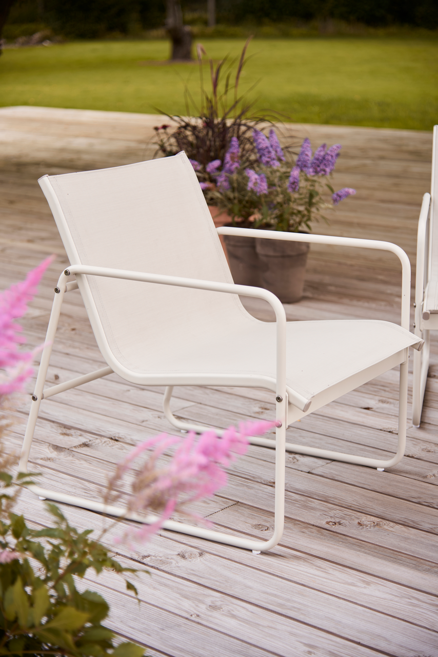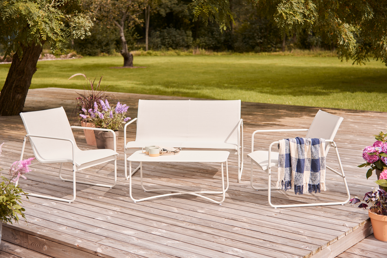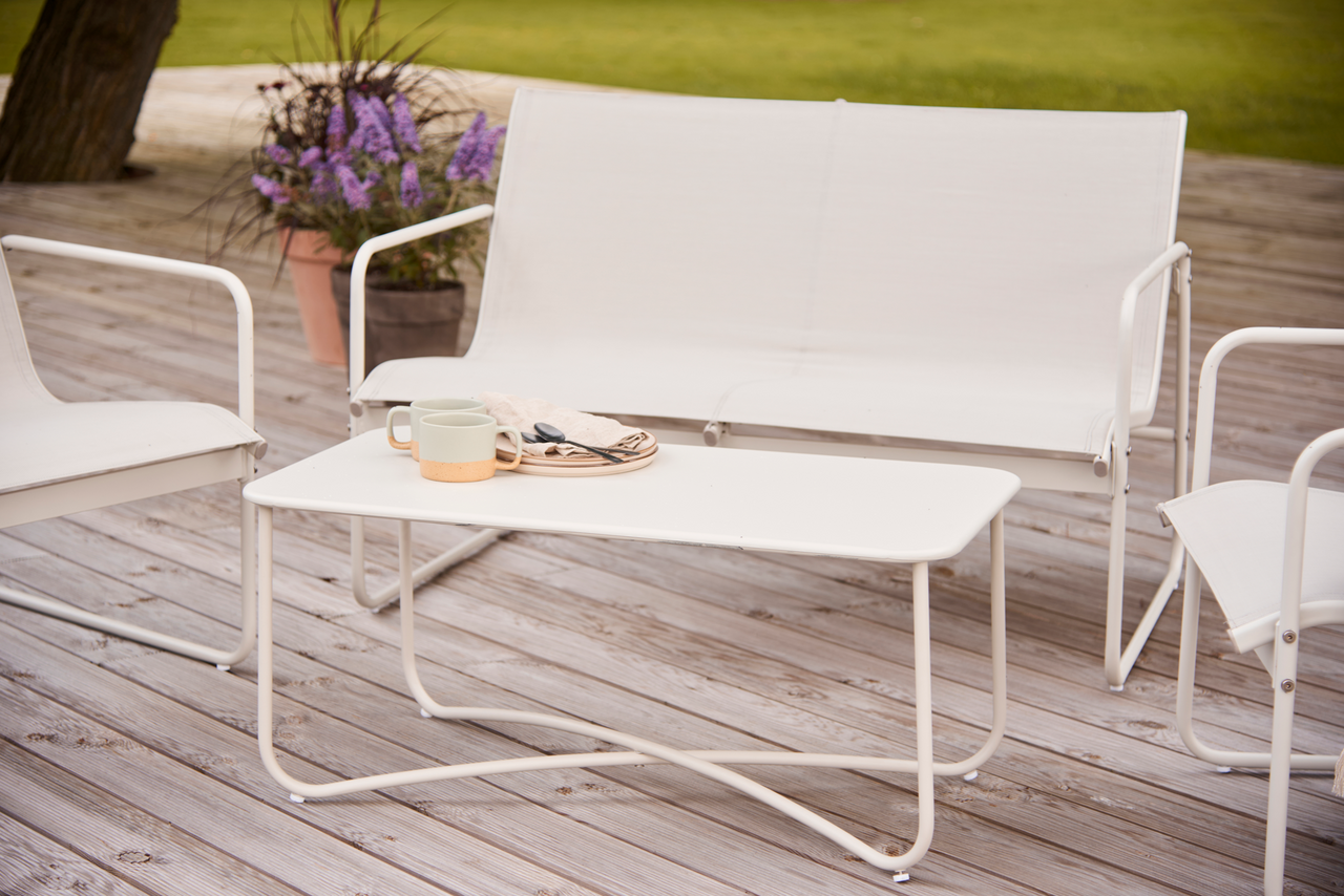 Dette sofasettet fra Envy kombinerer solid metallramme med komfortable tekstilflater og passer ideelt på terrasse, balkong eller i hagen.